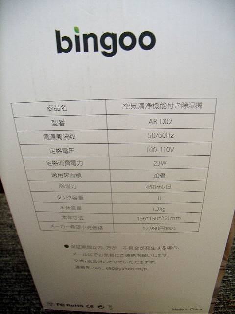 =USED/同梱不可=bingoo 空気清浄機能付除湿機 AR-D02 強力除湿 空気清浄 1L マイナスイオン発生/M113421