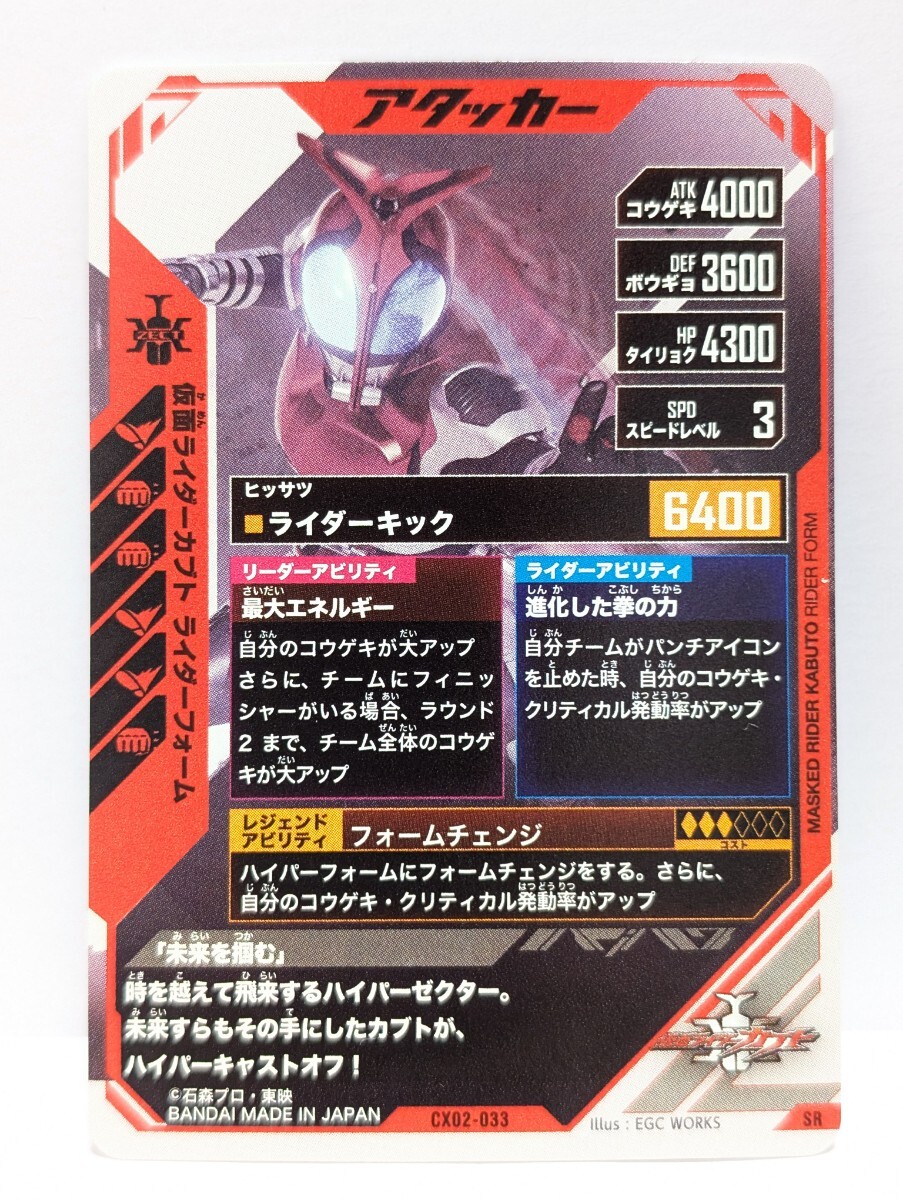 「仮面ライダーバトル ガンバレジェンズCX2弾 仮面ライダーカブト ライダーフォーム(SR CX02-033)」を出品します。「おまとめ」可能な方は4枚までミニレター送料85円でお取扱いできます。5枚以上の場合は定形郵便で送料別途計算となります。