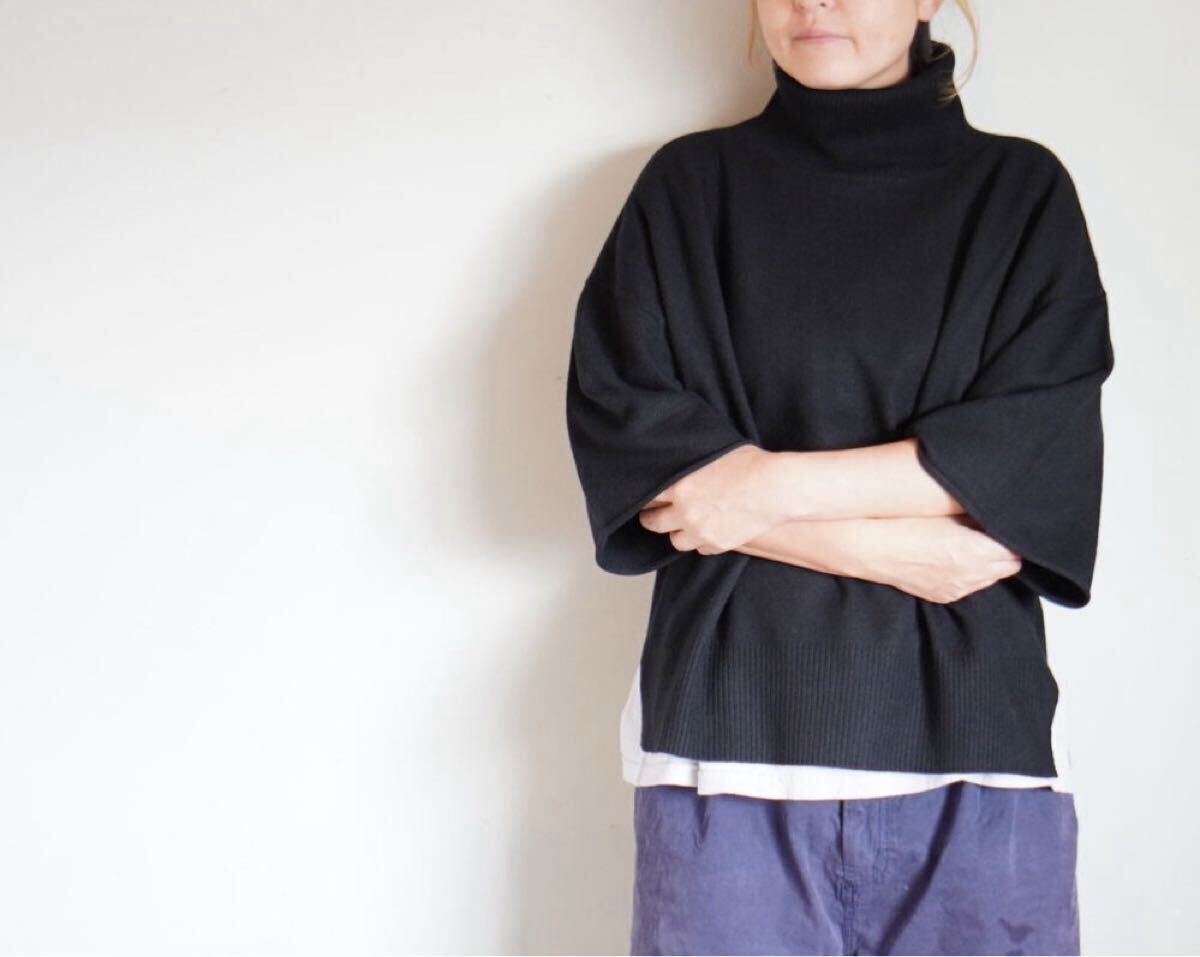 ゆったりしたタートルネックと7分袖のテサインか可愛いヒックスリーフフルオーハー。柔らかな生地感のニットて中にシャツやカットソーを合わせて色々なレイヤートをお楽しみください。