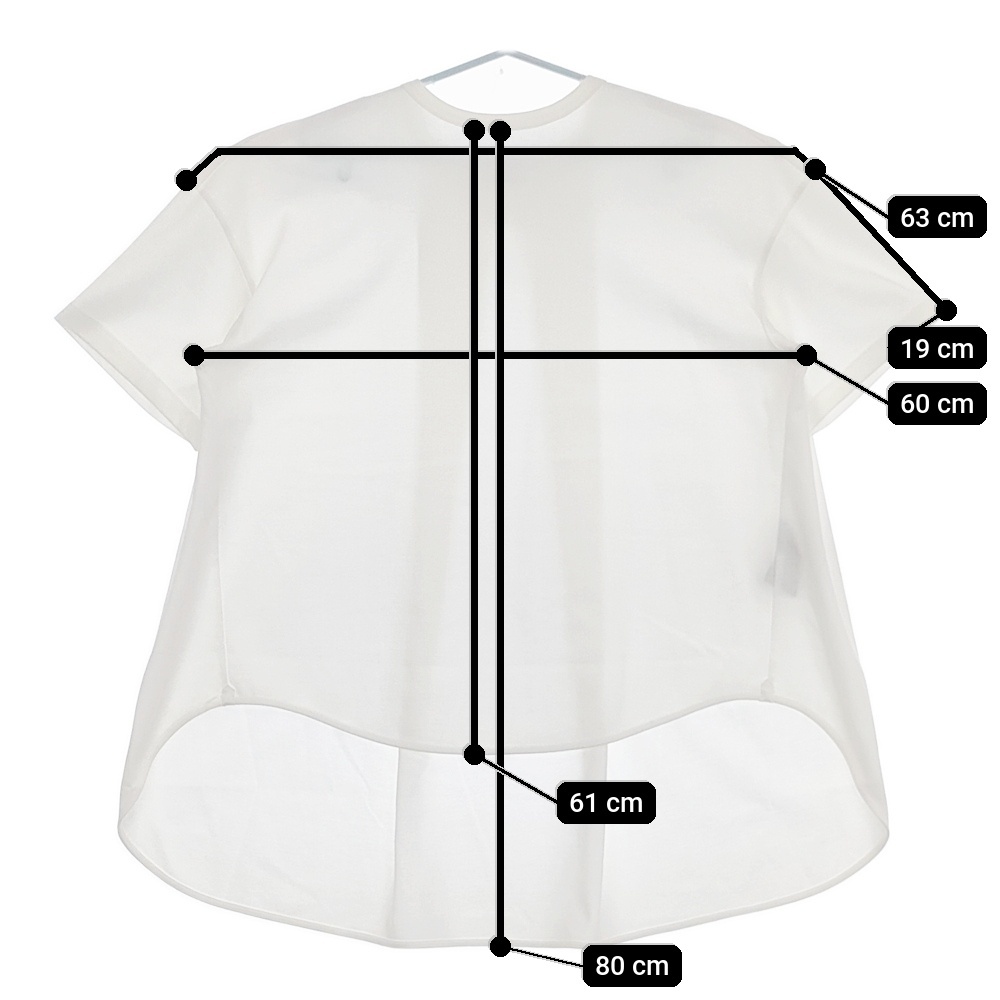 | 実寸サイズ | 肩幅:約63cm 着丈:約80cm 着丈(前):約61cm 身幅:約60cm 袖丈:約19cm 備考 身幅おおよそ ※記載以外のサイズが合わないことを理由とした返品はできませんので、 記載部分以外で実寸サイズの気になる箇所があれば必ず購入前にご質問ください。 |
