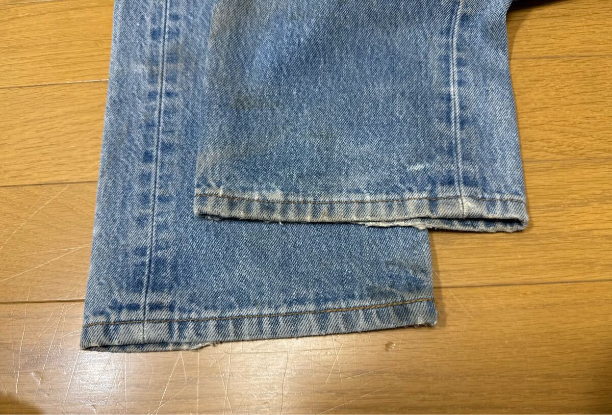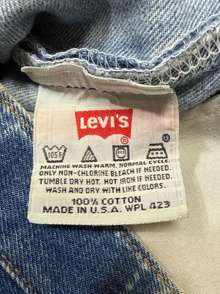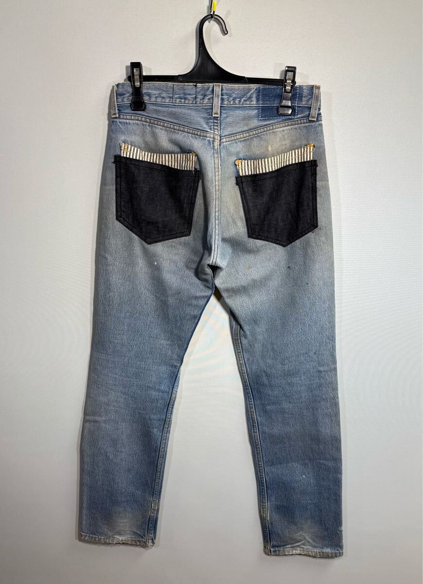 90年代のLevi's 501ストレートデニム、ダメージ加工とデザインポケットが特徴。