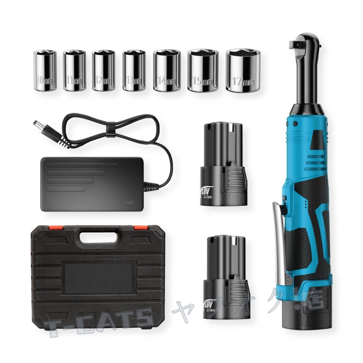 仕様: 材質:ゴム+ ABS +スチール 青色 充電電圧:ユニバーサル電圧 最大トルク:100nm 無負荷回転速度:230rpm 電池電圧:18V 電池容量:8000mah ヘッドサイズ:3/8 (10mm) 角度:90 充電電圧:110~240V パッケージは以下を含みます: 1×直角レンチラチェット 1 x充電器 7×ソケットセット(10mm 11mm 12mm 13mm 15mm 15mm 17mm)(オプション) 2×リチウムイオンバッテリー 1 xユーザーマニュアル