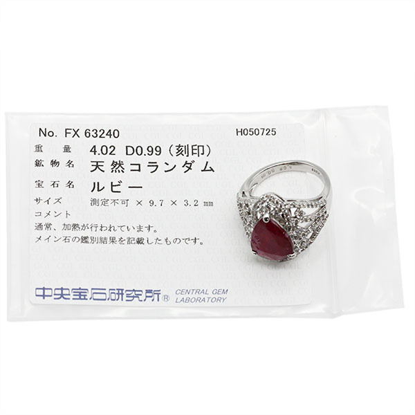 プラチナ ルビー ダイヤモンド リング 12号 R4.02ct D0.99ct Pt900 指輪 ジュエリー レディース 女性 プレゼント