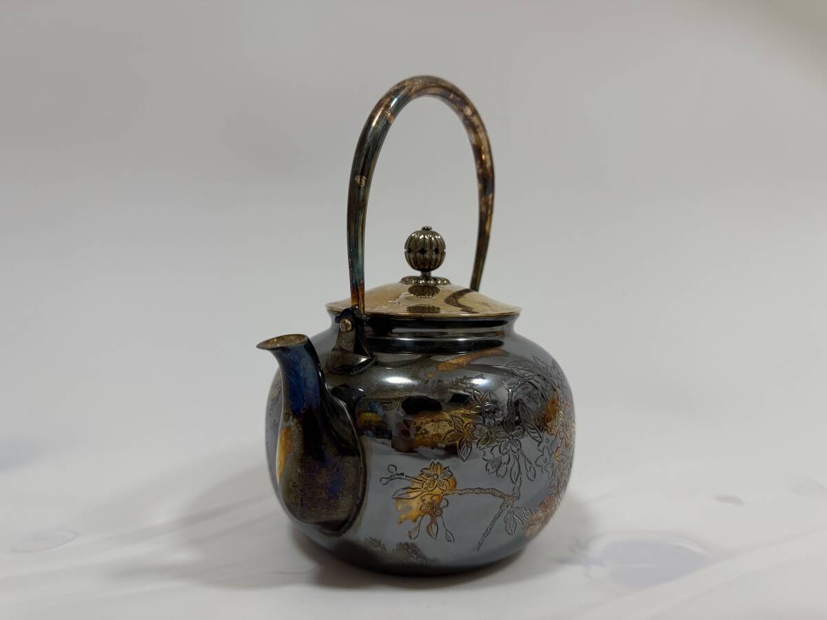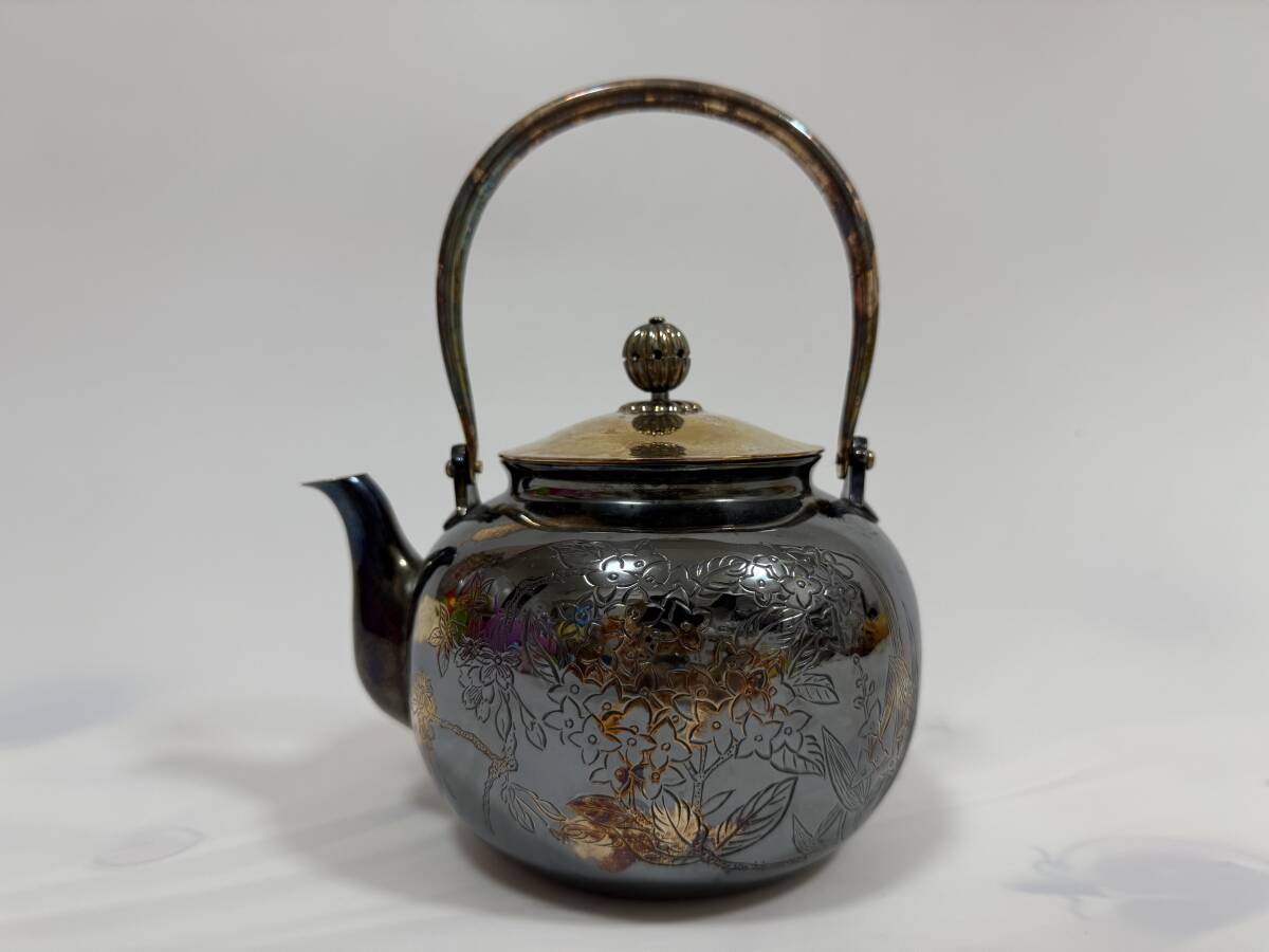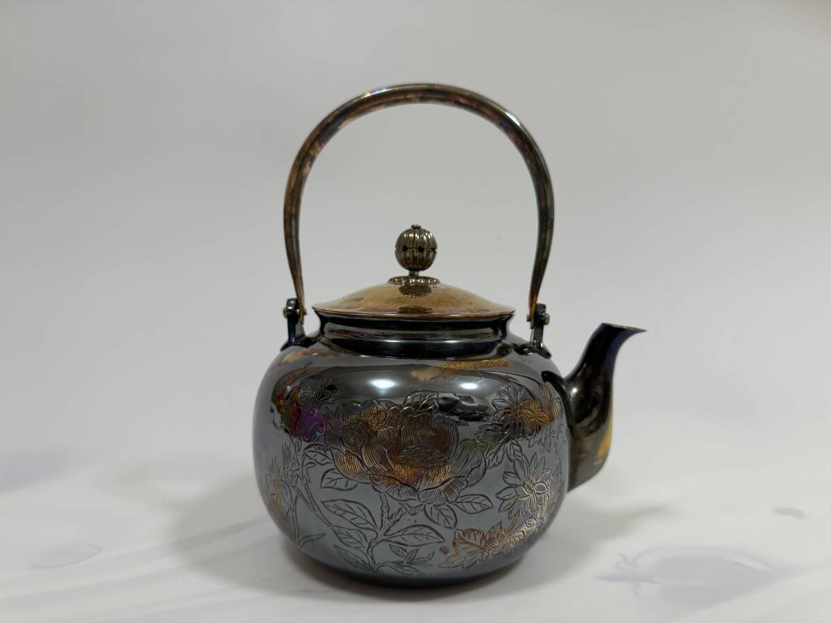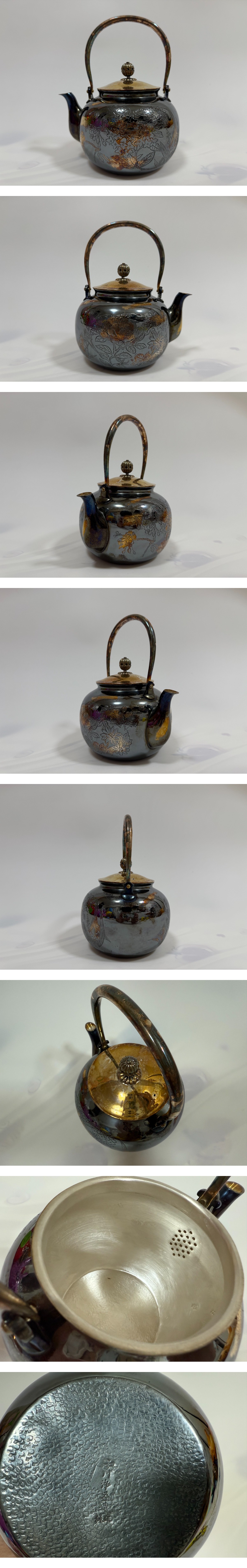 時代 純銀製 中川浄益造 草花紋様彫り 望月形 湯沸 工芸品 古美術品 銀瓶 煎茶道具