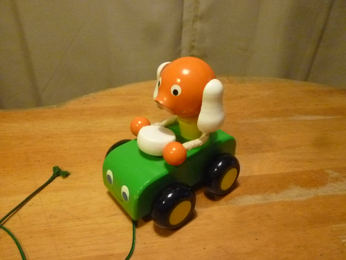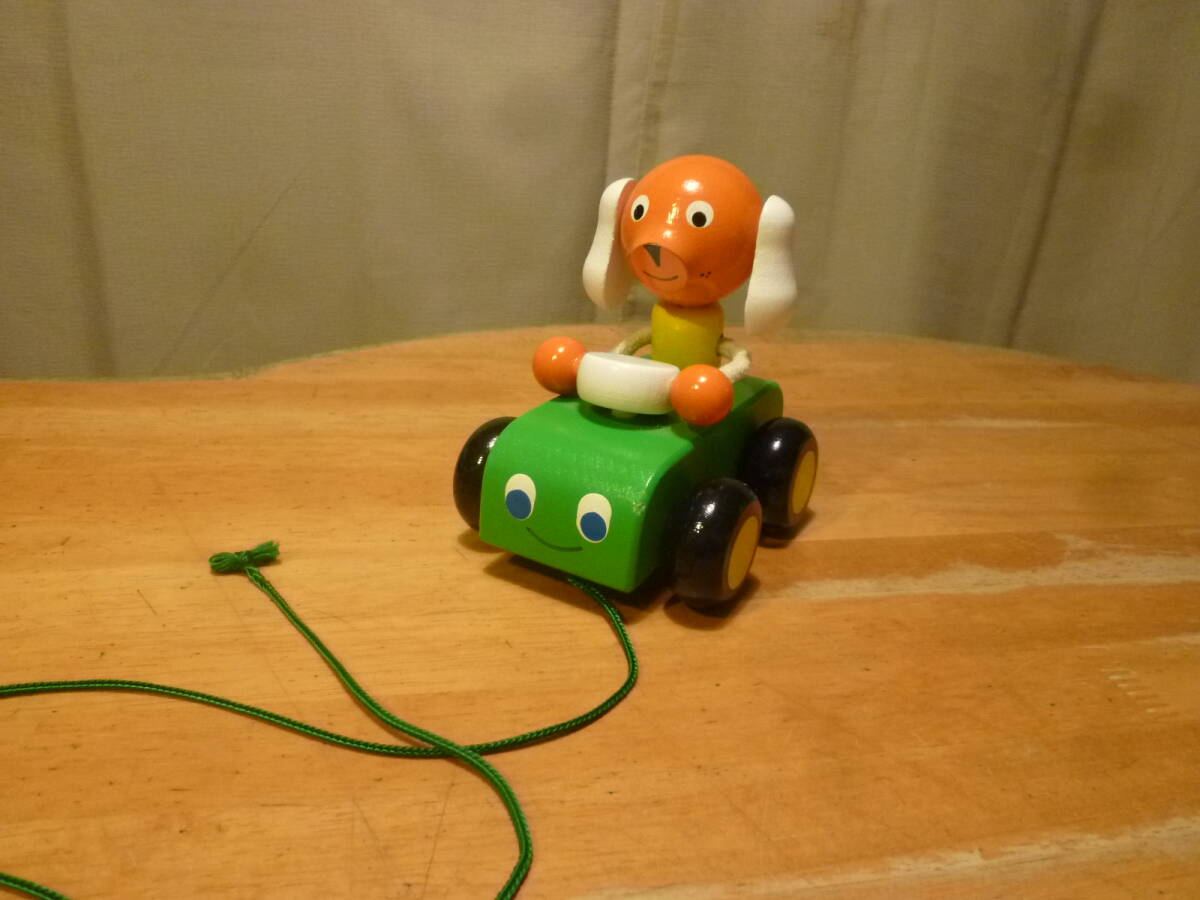 こちらは木製のワンちゃんの引き車の様です。大きな両耳はクルッと回転したり、腕は太い紐状で自由に変形して動き、引いて歩くとワンちゃんは身体を前後や上下にのけぞる様に動かし、その都度耳も揺れ動きます。