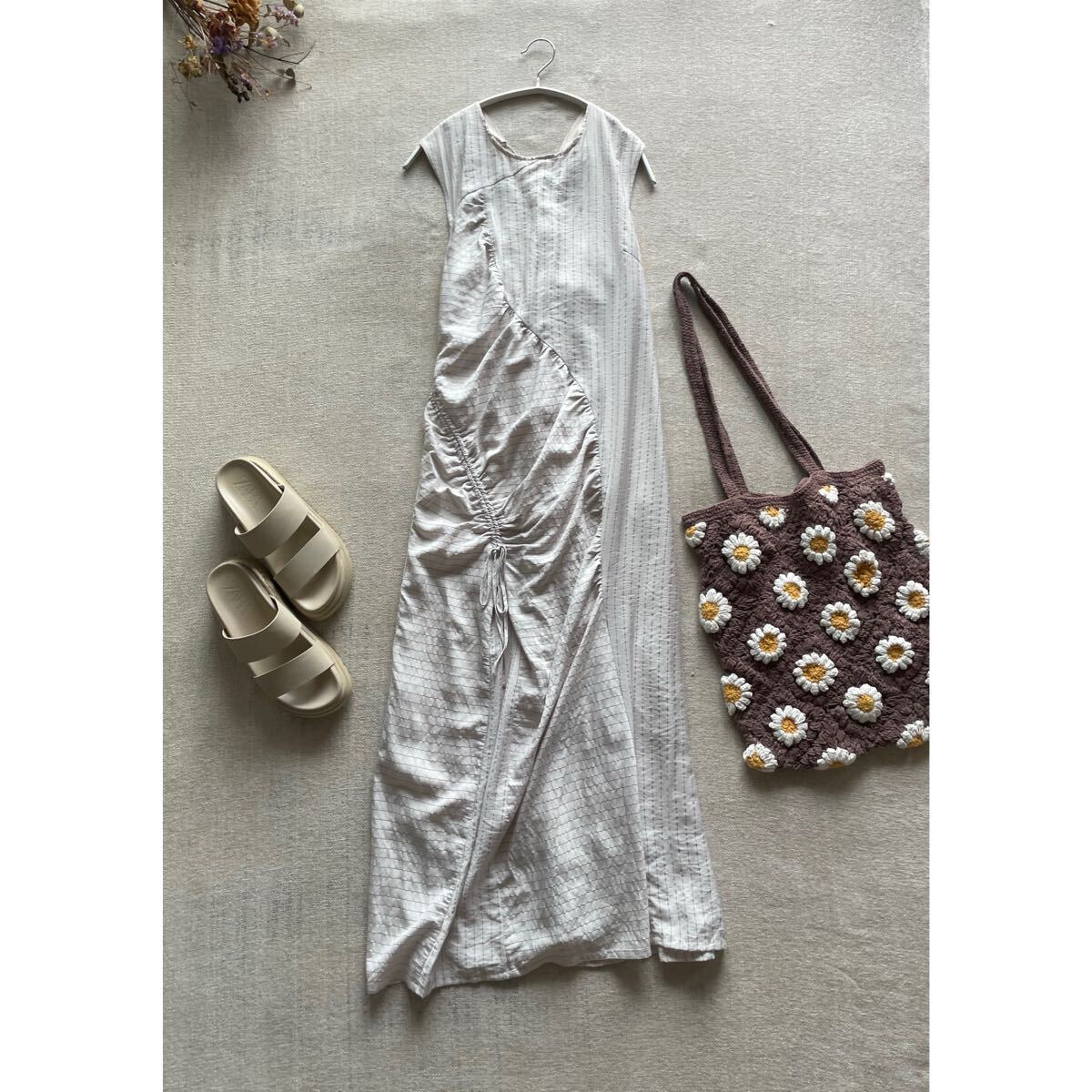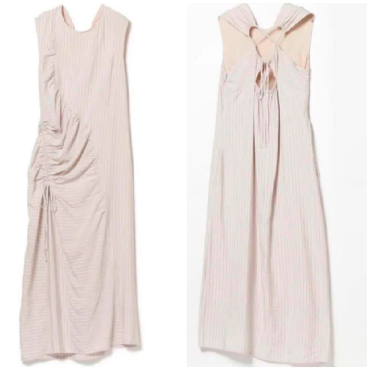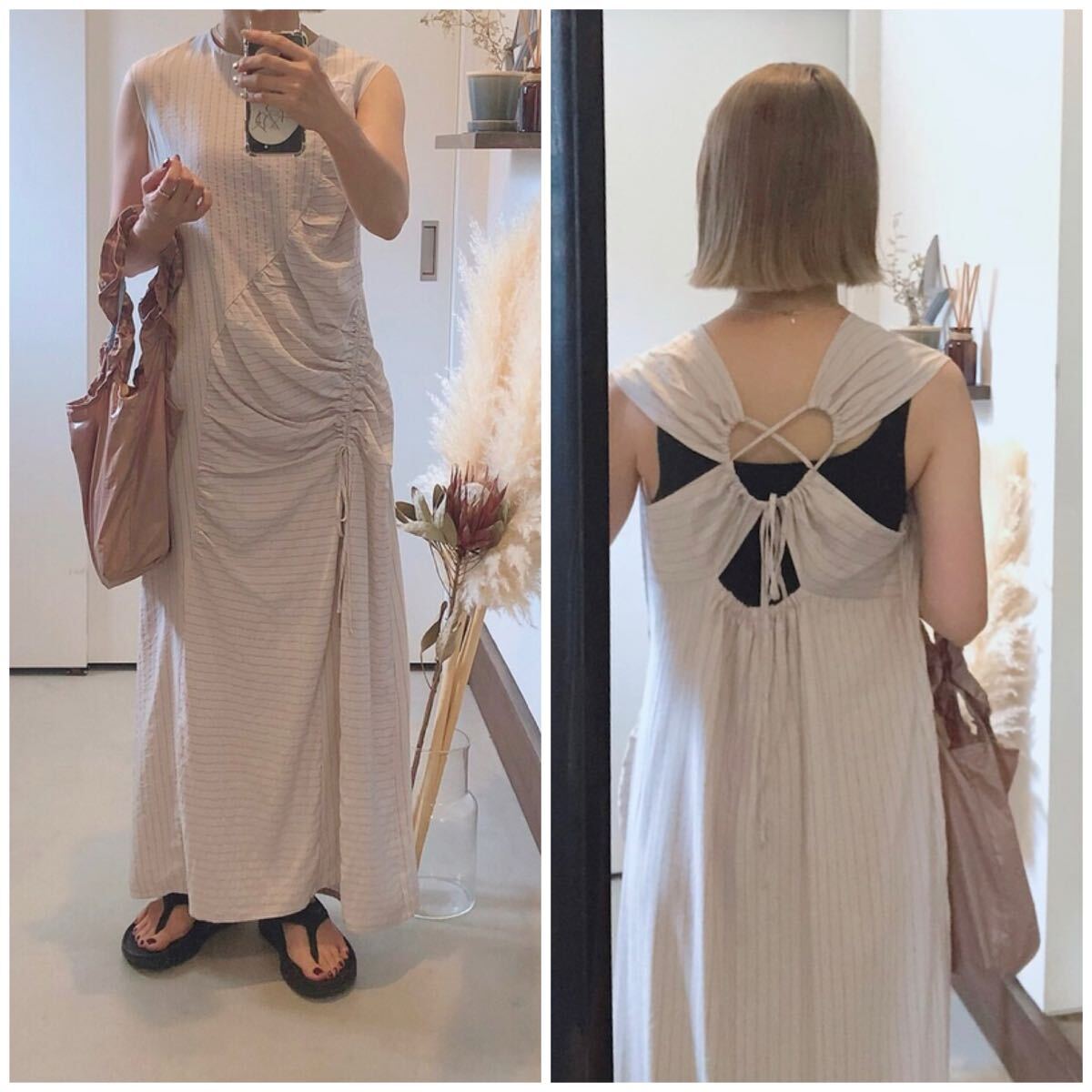 オリジナル配色のストライプ生地を使用したワンピース。立体感のあるデザインとバックススタイルが魅力的です。前のドロストと後のカッティングの下側の調整が出来るので、ニュアンスの変化もお楽しみいただけます。ドロスト部分の下側には隠しタックが入っていて、スカート部分の分量が出るように設計。