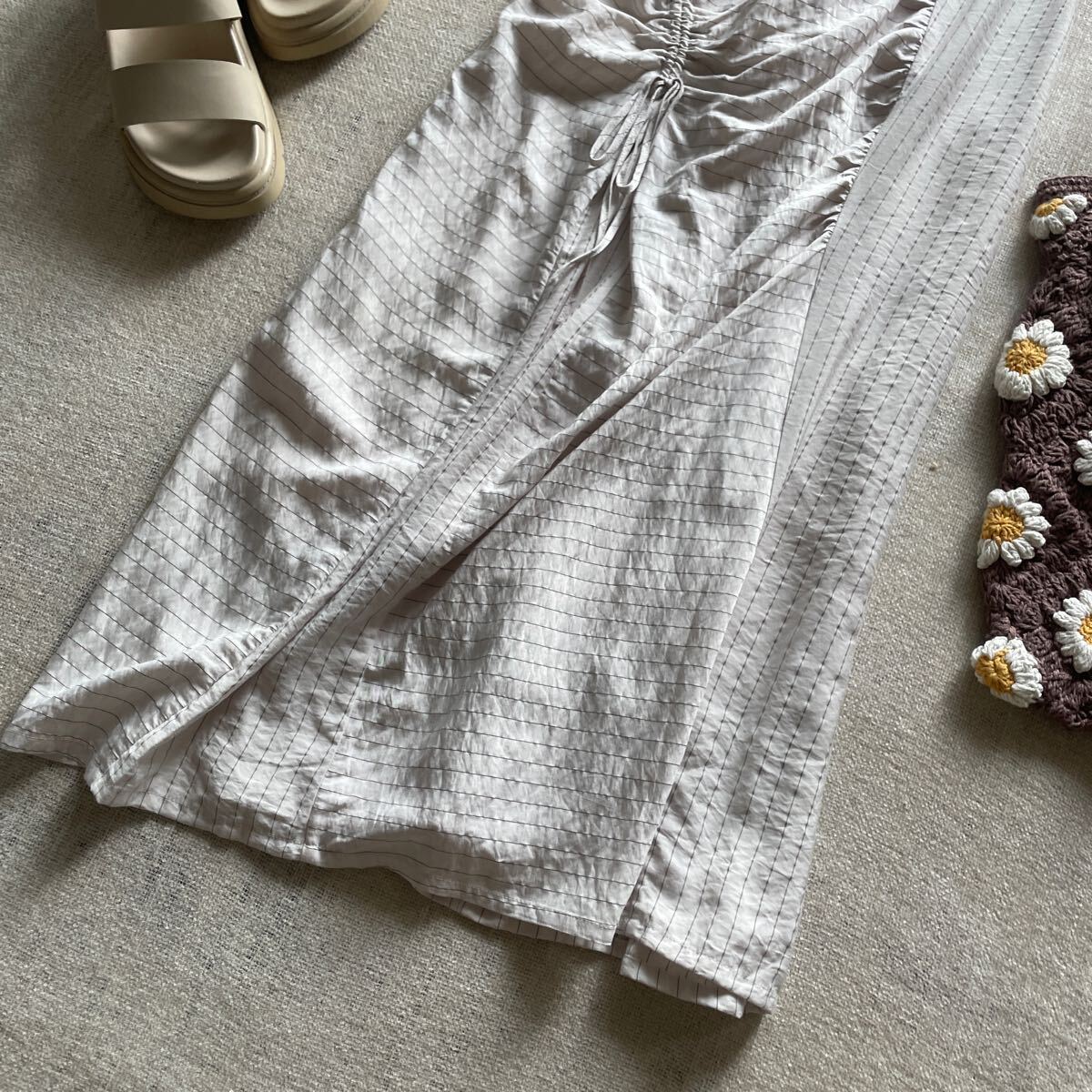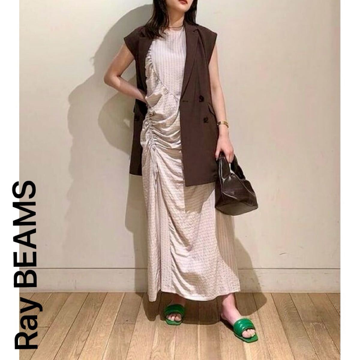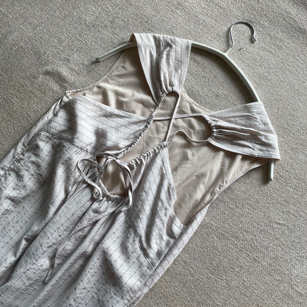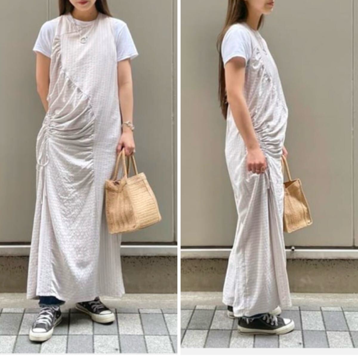 オリジナル配色のストライプ生地を使用したワンピース。立体感のあるデザインとバックススタイルが魅力的です。前のドロストと後のカッティングの下側の調整が出来るので、ニュアンスの変化もお楽しみいただけます。ドロスト部分の下側には隠しタックが入っていて、スカート部分の分量が出るように設計。
