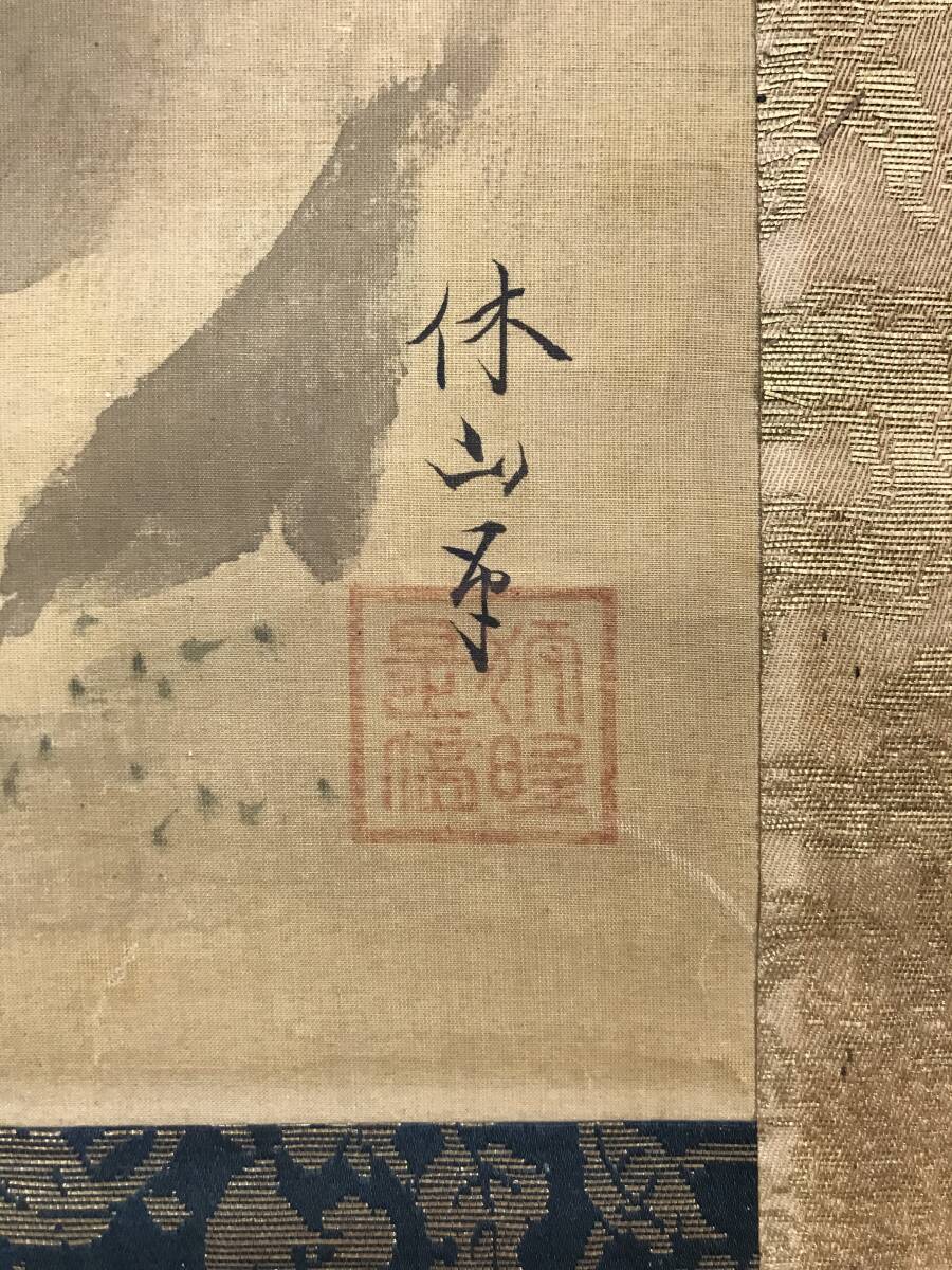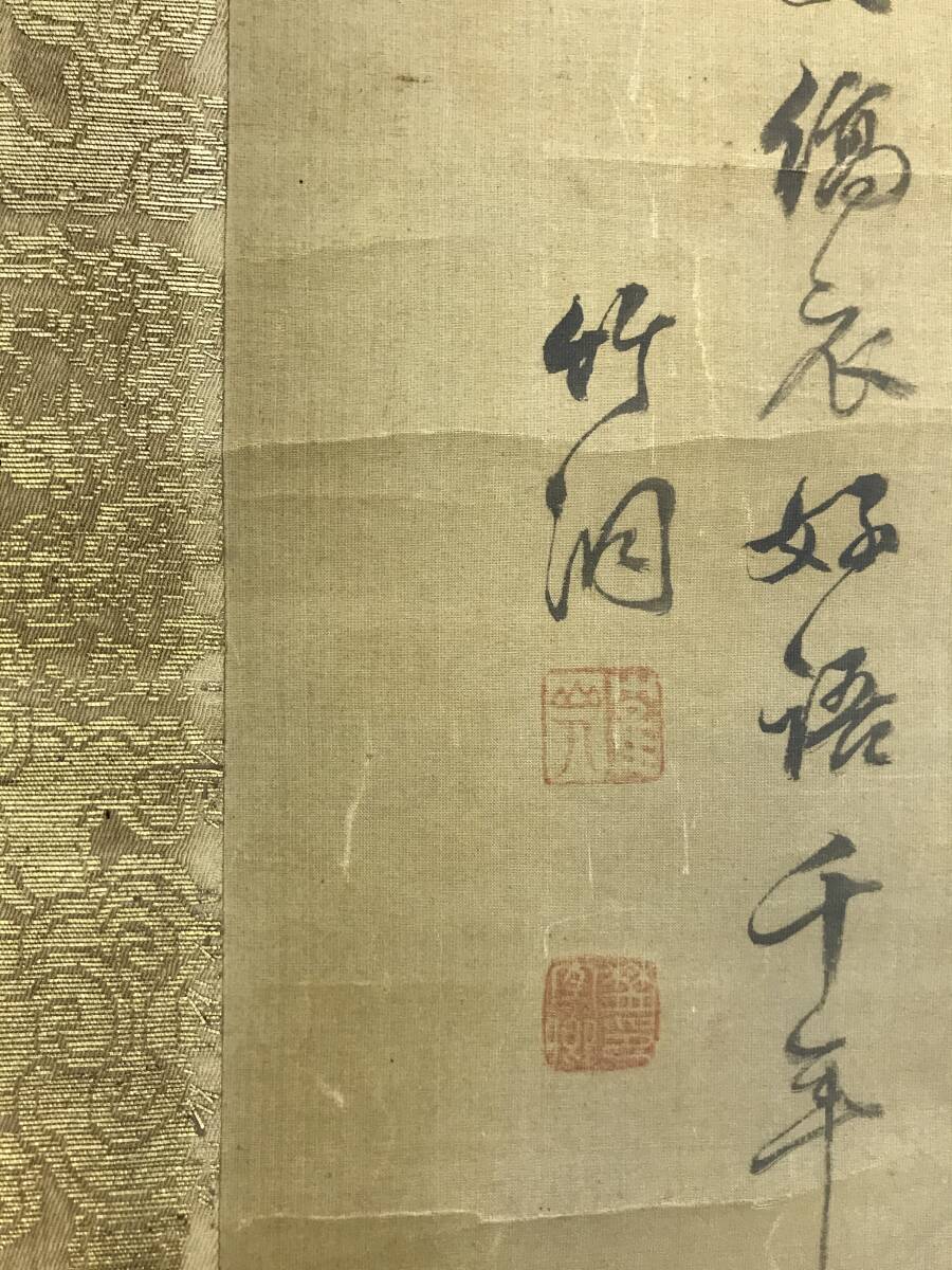 【作品状態】 本紙は絹本肉筆です。本紙は時代感あり、全体に多数の折れ、巻シワあります。表装は時代感あり、多数の虫穴、ホツレ、欠損、折れ、巻シワあります。
