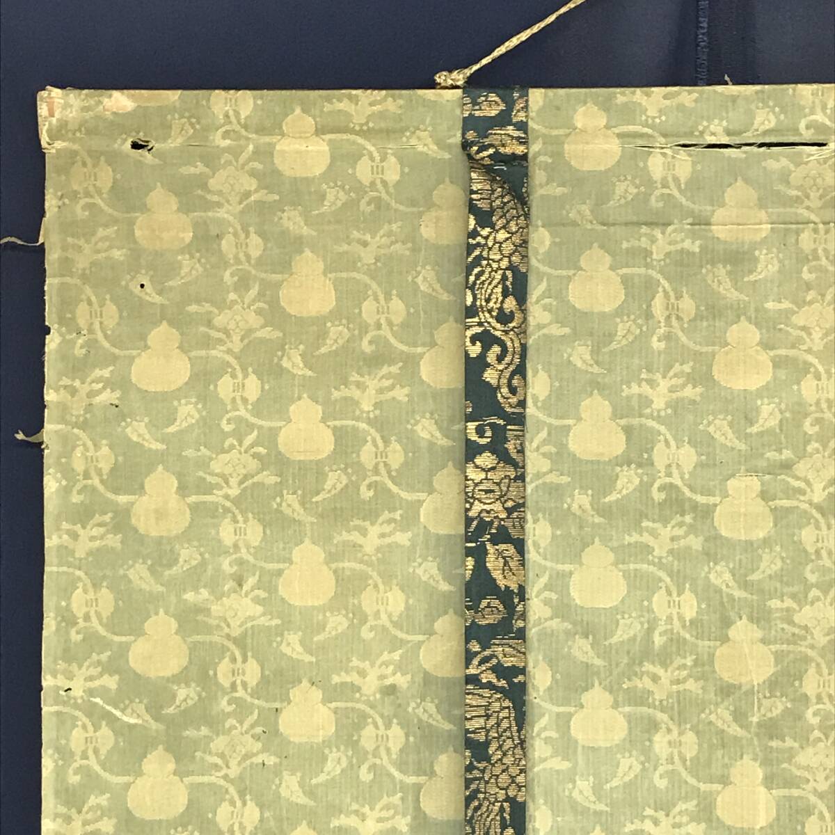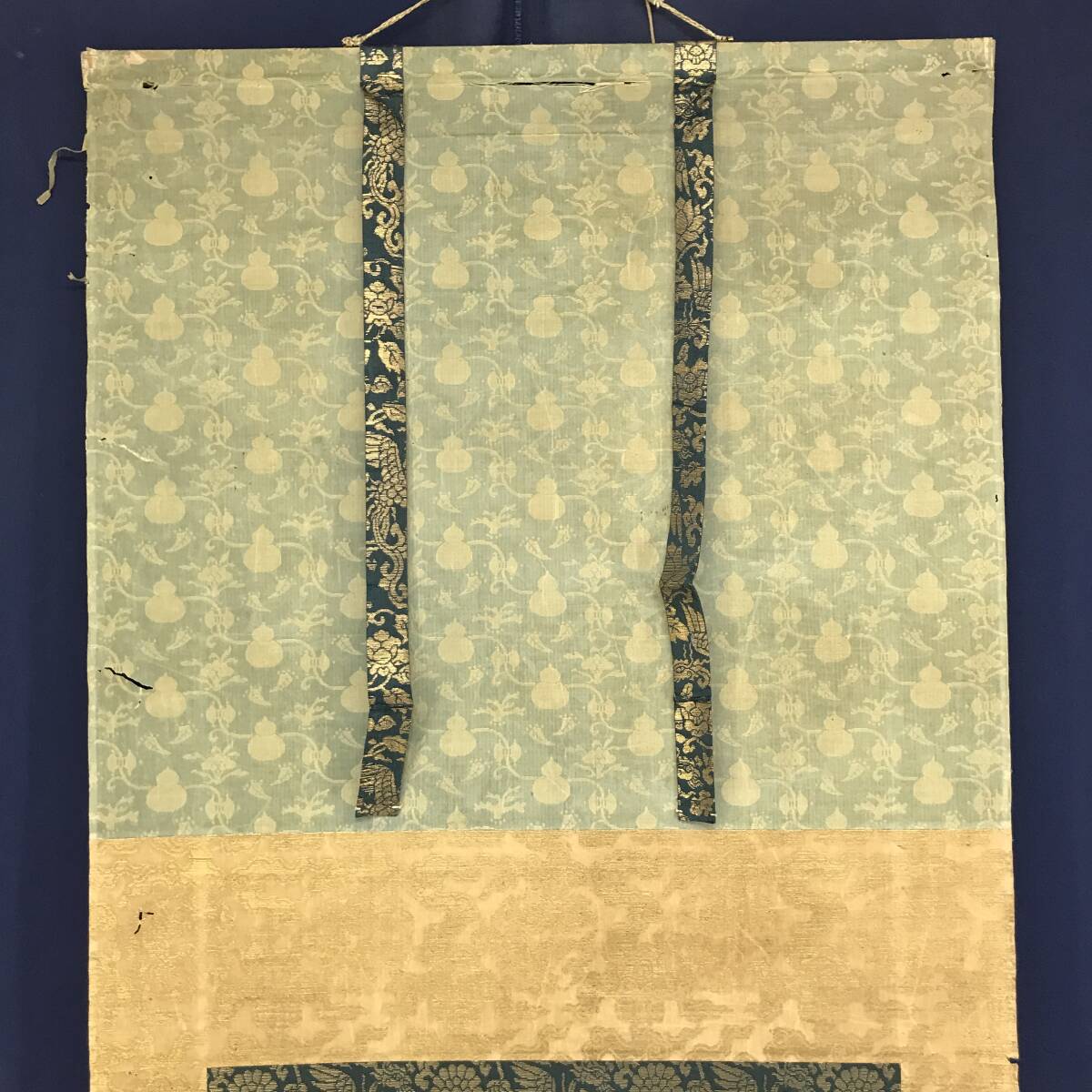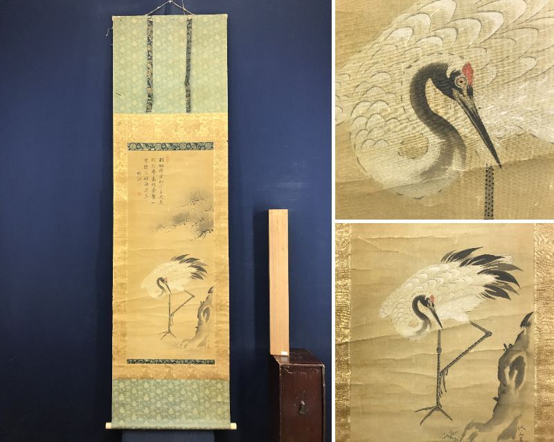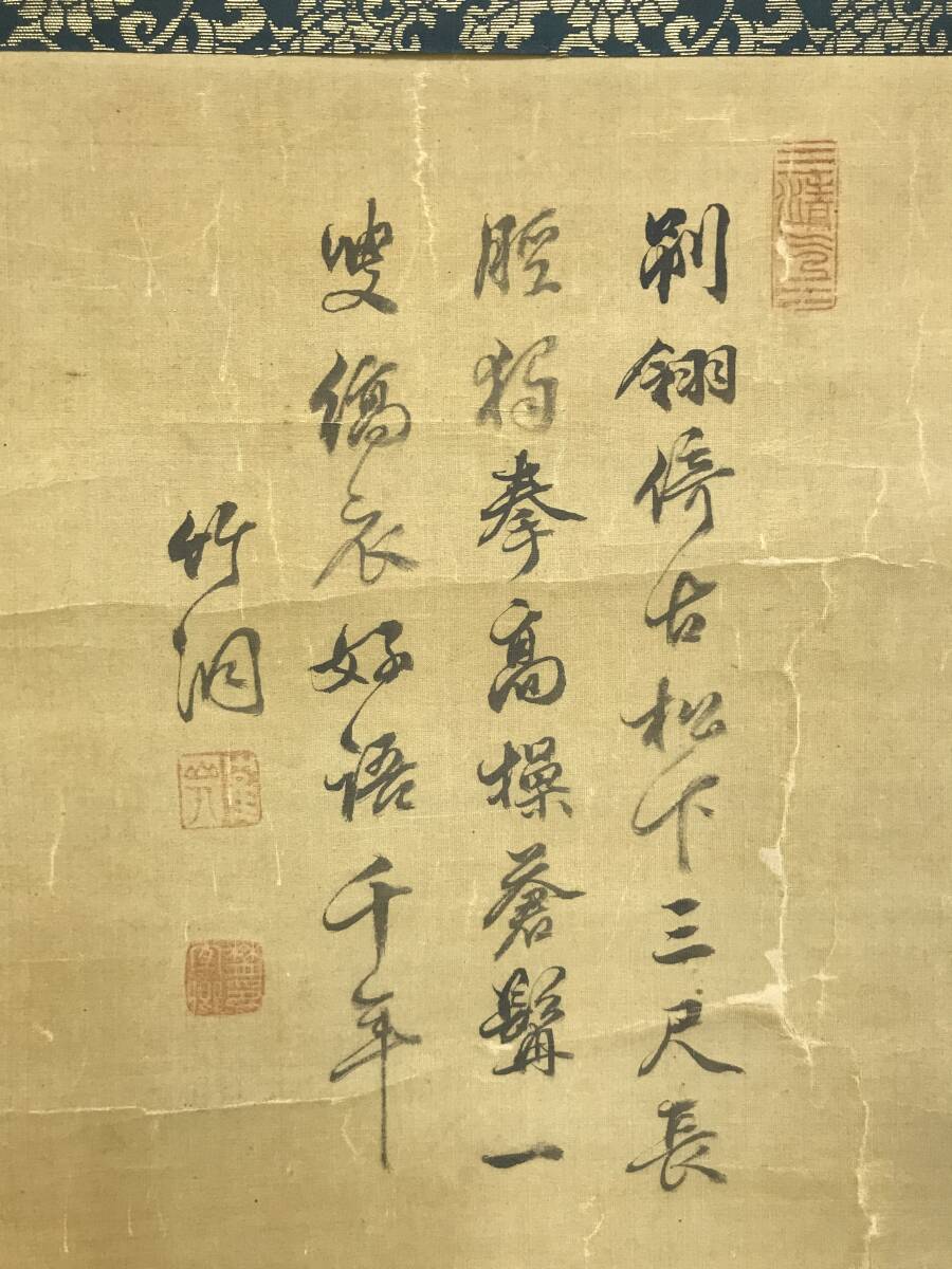 【作品状態】 本紙は絹本肉筆です。本紙は時代感あり、全体に多数の折れ、巻シワあります。表装は時代感あり、多数の虫穴、ホツレ、欠損、折れ、巻シワあります。