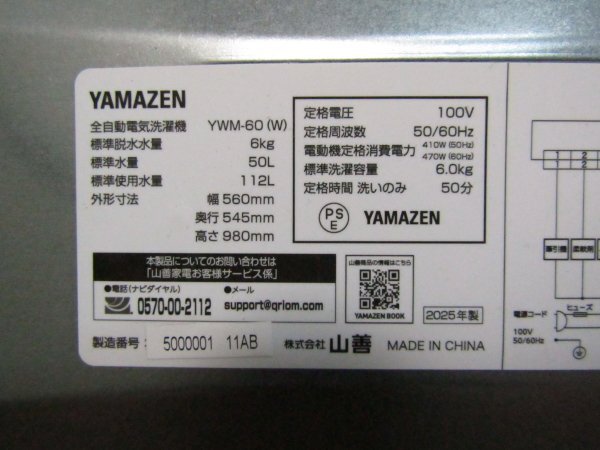 ■展示品■YAMAZEN/山善■全自動電気洗濯機■標準洗濯容量6.0kg/標準脱水容量6.0kg■小型■2025年製■YWM-60(W)■kdnn3944k