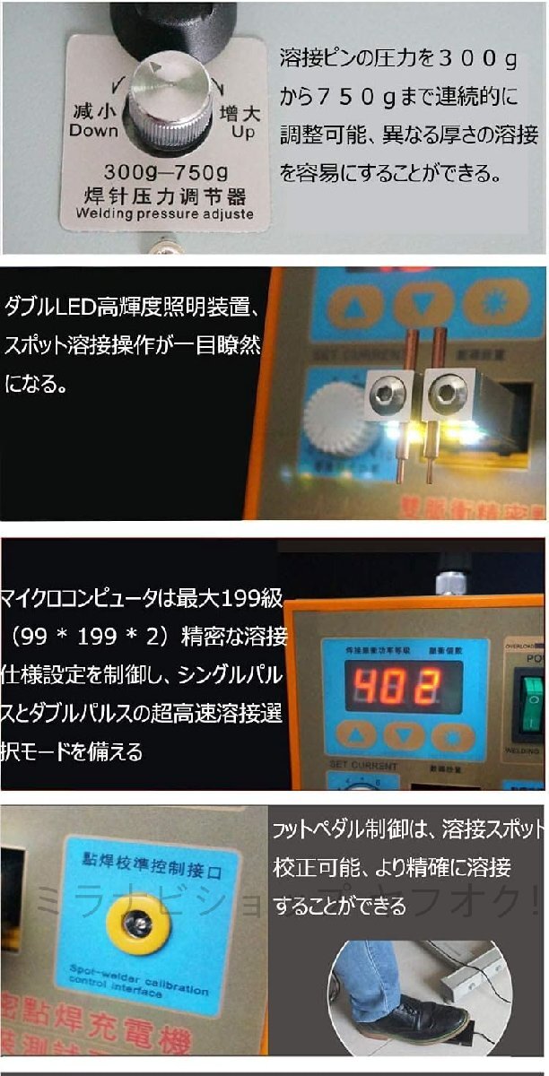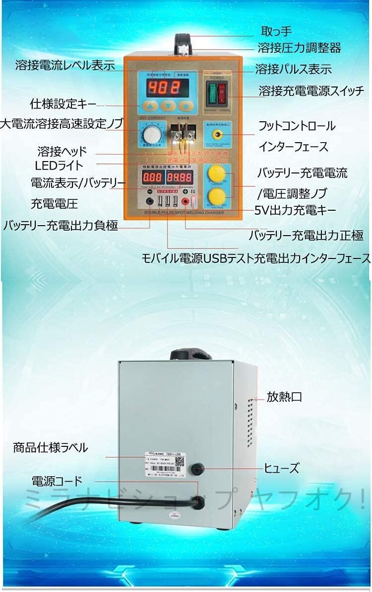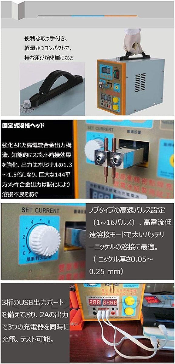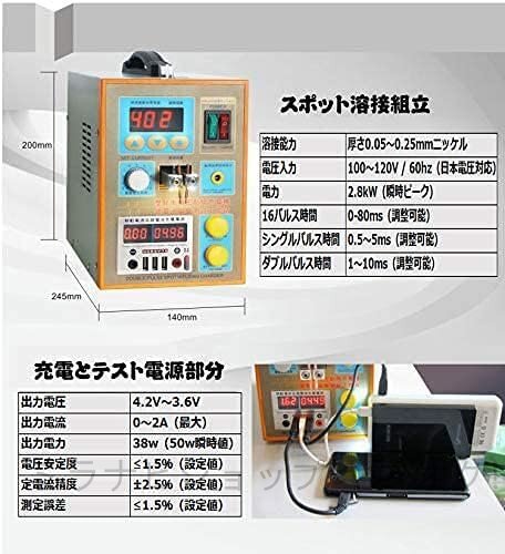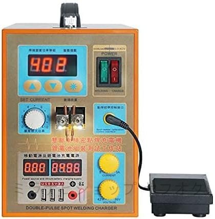 ●【幅広い用途】各種の携帯の電池、パソコンの電池の溶接と組立;金物の精密部品加工溶接はもじろん、モバイル電源・携帯電話・パソコン等を充電・充電測定することもできます。 ●【電池溶接・充電兼用】●電池溶接:1P・2P・16Pパルス、50~800A溶接電流、300~750g溶接圧力。0.05㎜~0.25㎜充電池タブ (純ニッケル /ニッケルメッキ)瞬時できれいに溶接できます。18650リチウムイオン電池を最大4行溶接可能です。●電池充電・測定:出力電圧4.2V~36V、出力電流0~2A。 ●【手動・フットペダル制御兼用】手動制御:電池を上に押しつけて溶接できます。精確な溶接を行う必要がある場合で、フットペダル制御をご利用ください。 ●【操作簡単】●電池溶接:①溶接針を取り付けて、充電池タブ 厚さに溶接の圧力を調整します。溶接電源スイッチ(緑色ボタン)をPOWER ONの位置に押して、溶接機が待機状態に入ります。③電流(CURRENT)の数値、(PULSE)の数値を設定してから、溶接できます。●電池充電・測定:①電源スイッチ(赤いボタン)をPOWER ONの位置に押して、溶接機が待機状態に入ります。②充電・測定電源コードを機器及び電池の正負極に接続して、電池充電(CHARGE)または測定(TEST)を選択します。③測定(TEST)の場合はその電池の電流電圧に表示されます。充電(CHARGE)の場合は右側のノブで電流電圧を設定してから充電できす。 ★商品写真はできる限り実物の色に近づけるよう努めておりますがご使用のPCモニター設定や部屋の照明により多少、色の変化が感じられる場合がございます