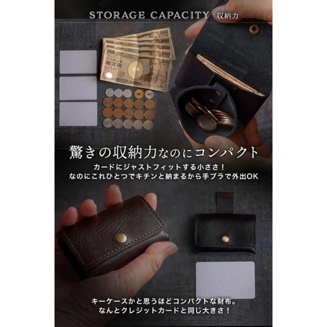 小銭20枚程度、カード3枚程度、お札5枚程度。ちょっとしたお出かけには十分な収納力です。