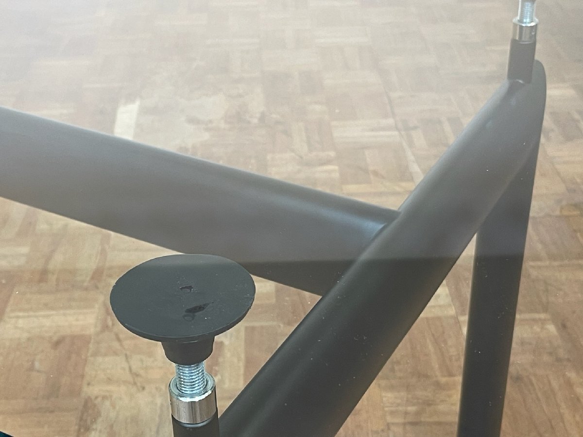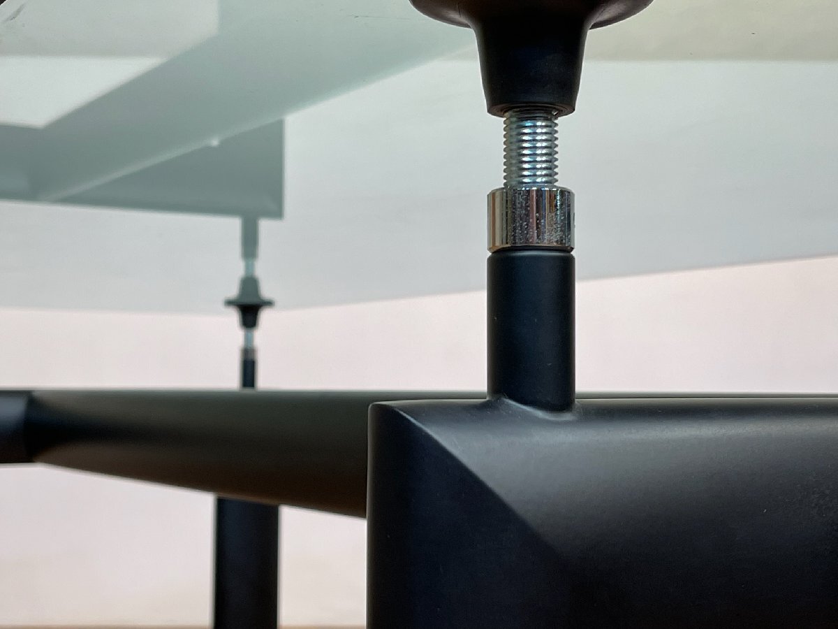 重厚なガラストップを支える4本のか細い支柱部材は高さ調整ギミックとしての機能する設計。