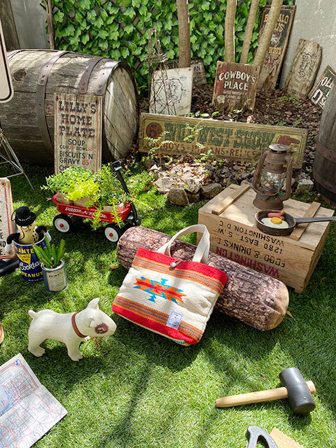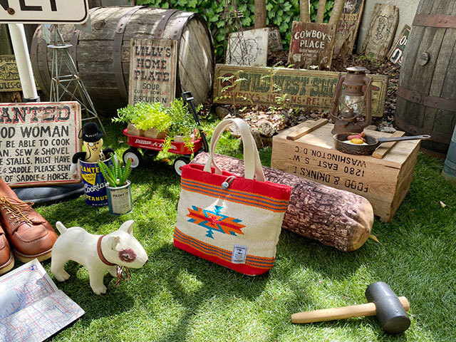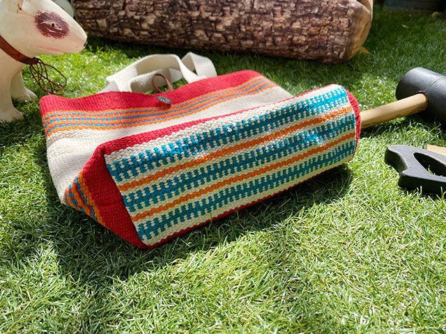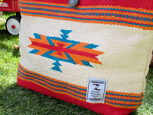 素材がまたすごくイイ風合いを出してて、ラグ生地が使われてるんだけど、型崩れしにくいしっかりとしたタイプで、デザイン部分はプリントではなく織り込み生地+コンチョボタンで留めてあるのでネイティブアメリカンの雰囲気がよーく出てるの!