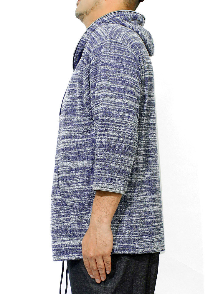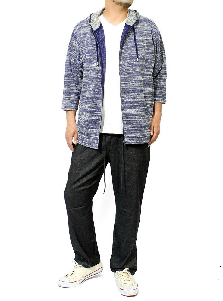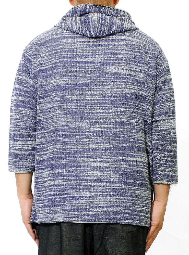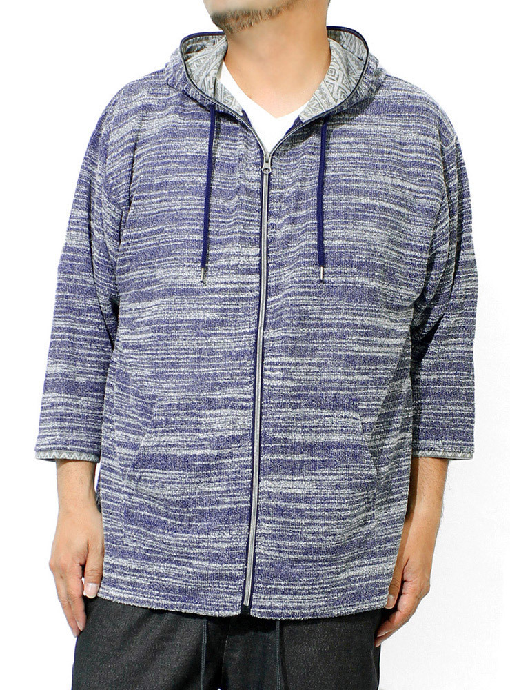 商品名 | 【新品】 5L 杢ネイビー パーカー メンズ 大きいサイズ ジップアップ 七分袖 スラブ サマーニット 薄手 ジャガード柄 切替 ジャケット |