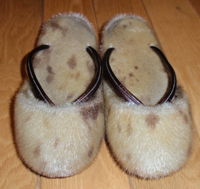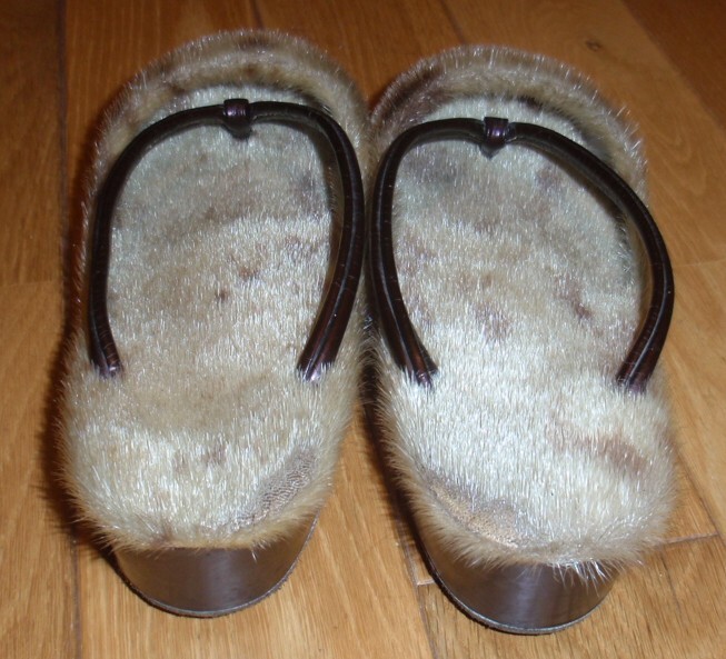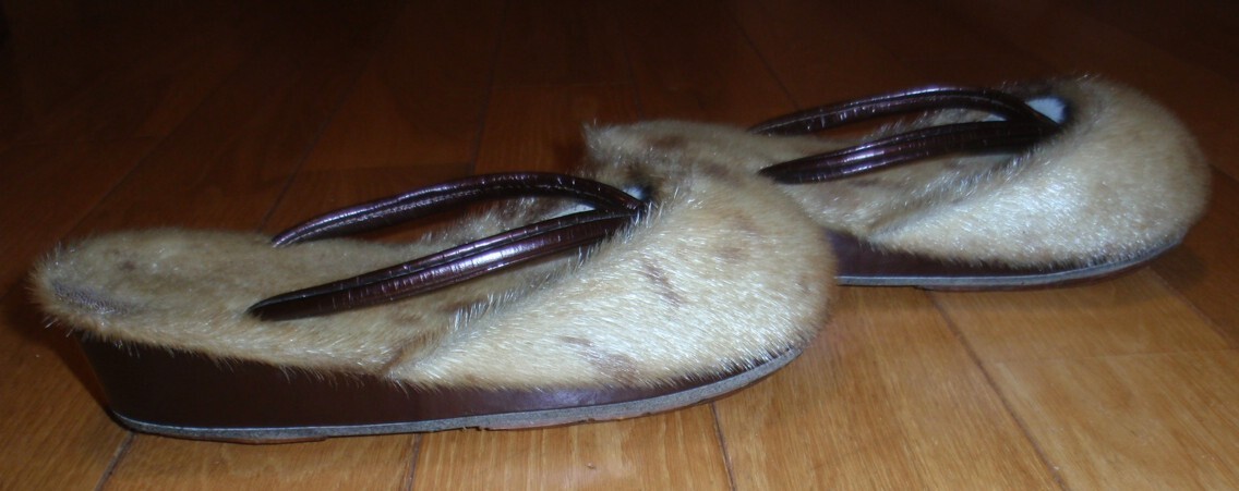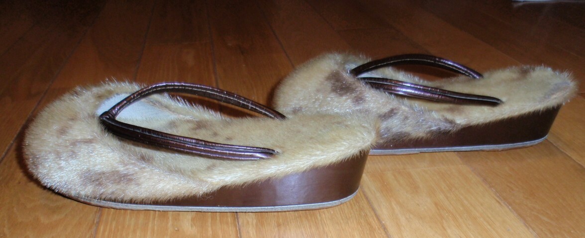 表と爪先カバーの表はアザラシ毛皮で、鼻緒と台側面はエナメル調の茶色、底面は雨天や積雪上でも滑りにくい生ゴムのグリップ底です。