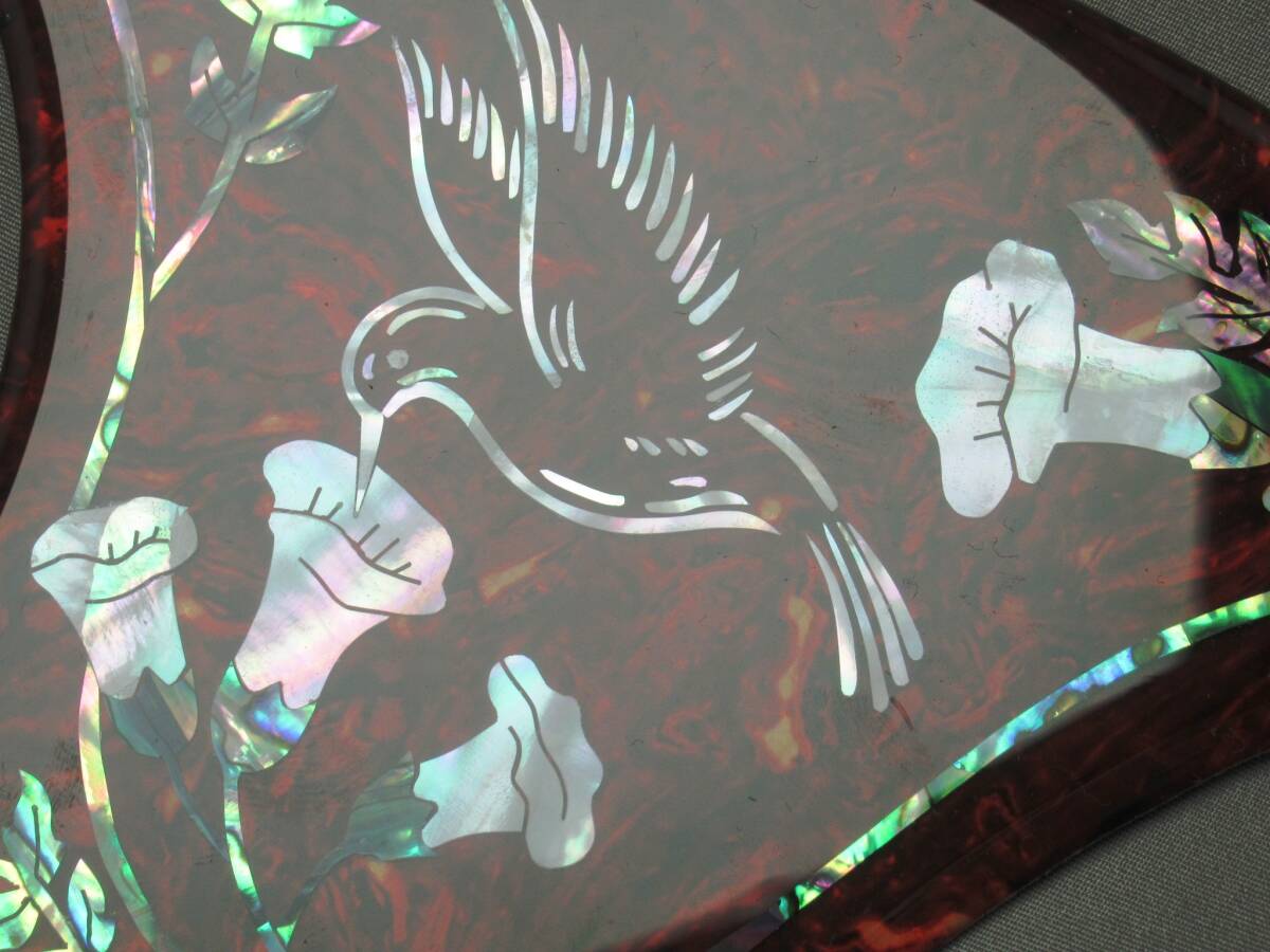 鳥や花の柄はたぶん貝のように見えるフェイクだと思いますが、柄すべてにこれらのものが施され、色合いが強い箇所はアバロン貝風、白っぽい箇所は白蝶貝風で、なかなかゴージャスな仕上がりになっています。