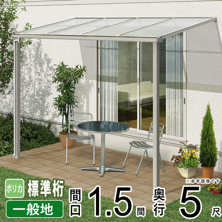 サイズ | 間口:1.5間(屋根外寸2,730mm) 出幅:5尺(出幅寸法1,470mm) 標準柱:高さ2,500mm Hmax(地面からテラス屋根本体の一番上まで):2,861.6mm |