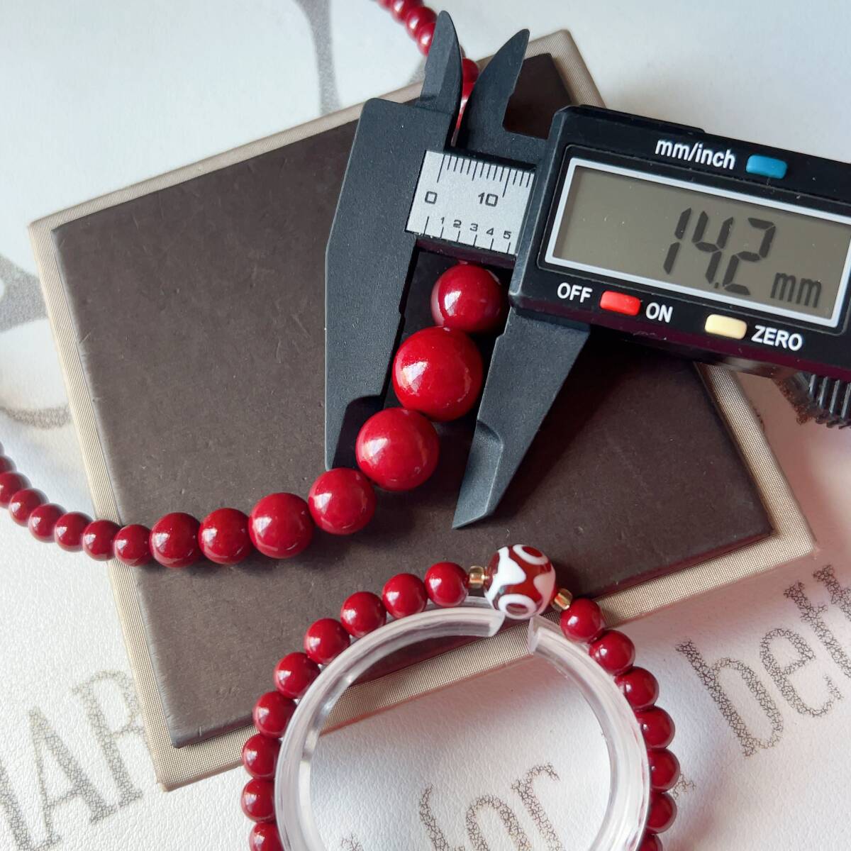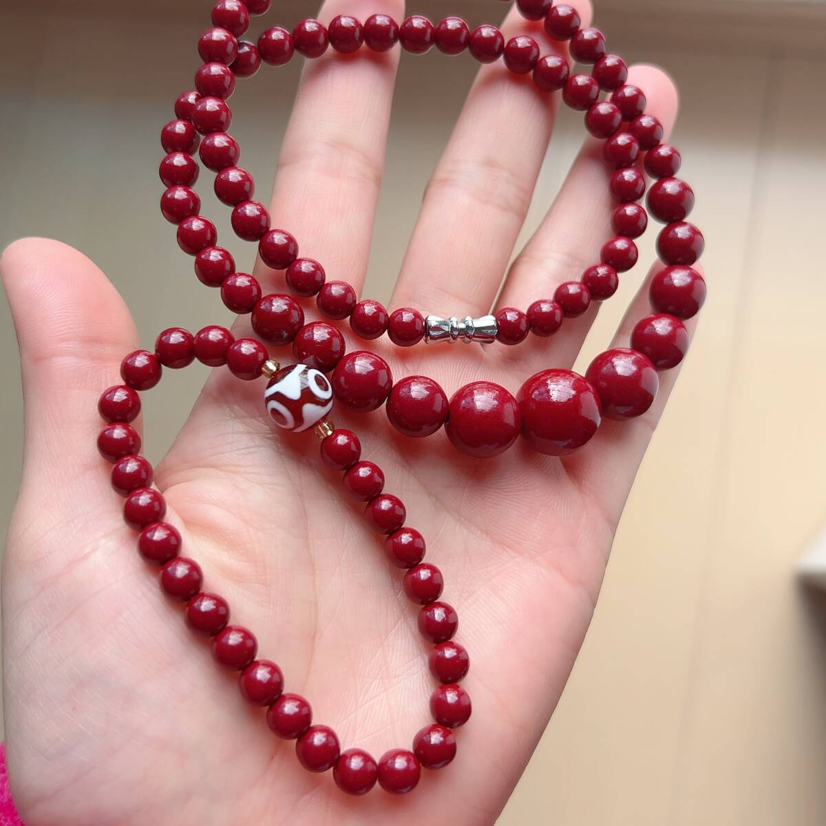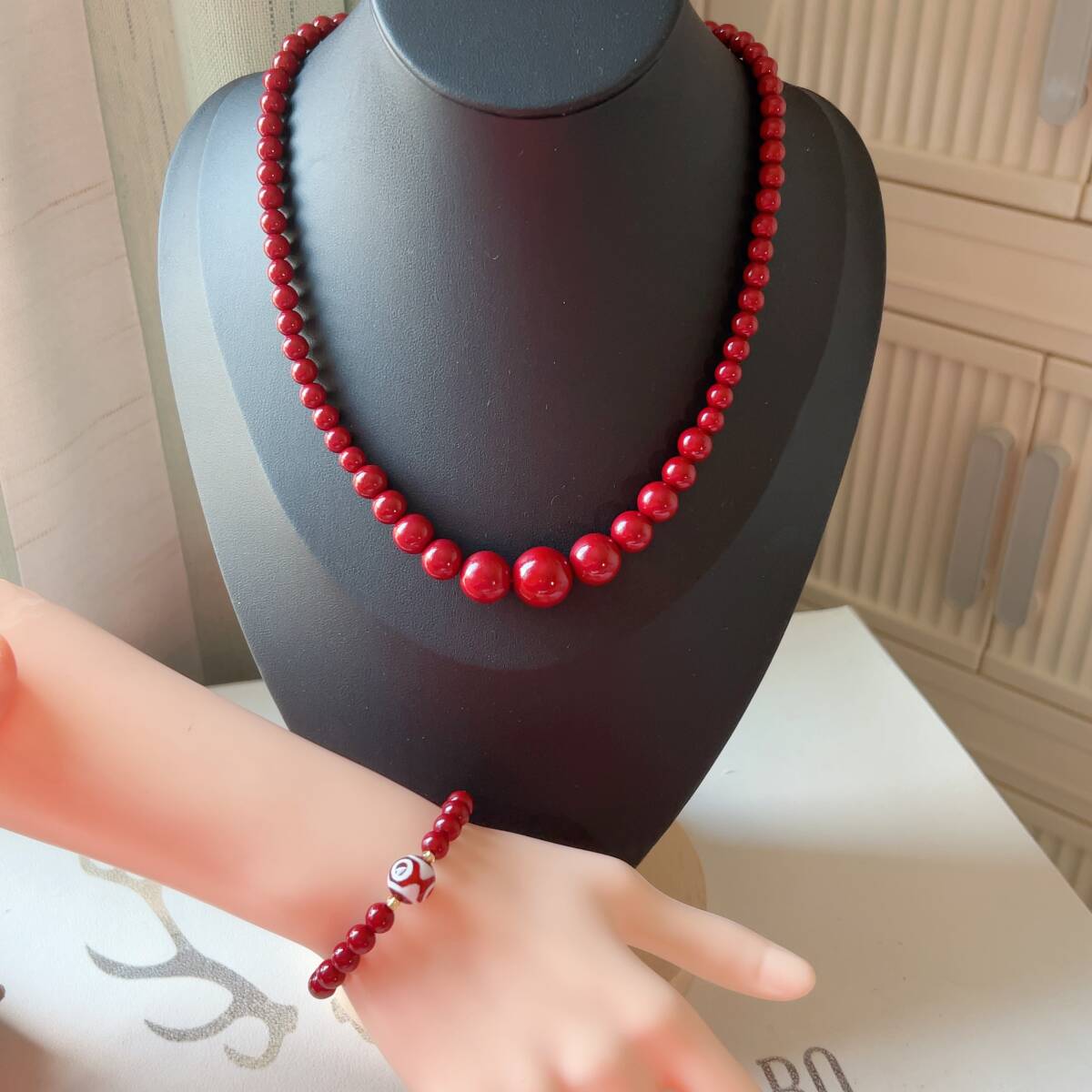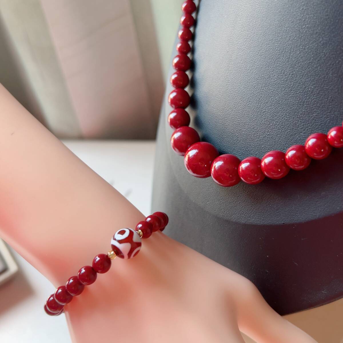 ◇シナバー(辰砂)◇ネックレス+ブレスレット(瑪瑙三目天珠)◇パワーストーン◇巾着袋付き◇プレゼントにも034S4111