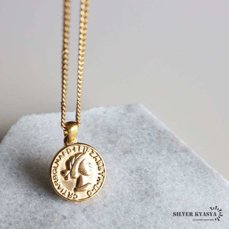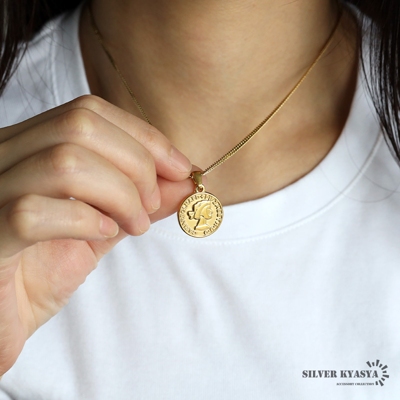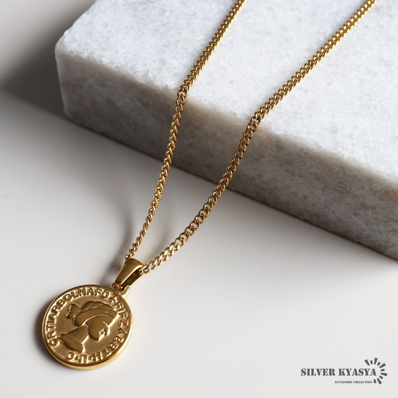 | 商品概要 | ■ITEM DETAIL アンティークコインをモチーフにしたネックレス。チェーンは密度の高い喜平タイプで、首元で存在感を発揮します。 ■ステンレス素材を使用 金属部分は頑丈なことで知られるステンレス素材を採用。耐久性はもちろん耐水性も高く水場での着用も可能。金属アレルギーも出にくいとされている金属です。 |