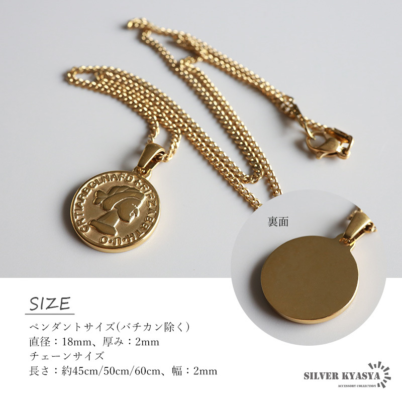 | サイズ | ■ペンダントサイズ(バチカン除く) 直径:18mm 厚み:2mm ■チェーンサイズ 長さ:約45cm/50cm/60cm(モデル着用サイズは45cm) 幅:2mm |