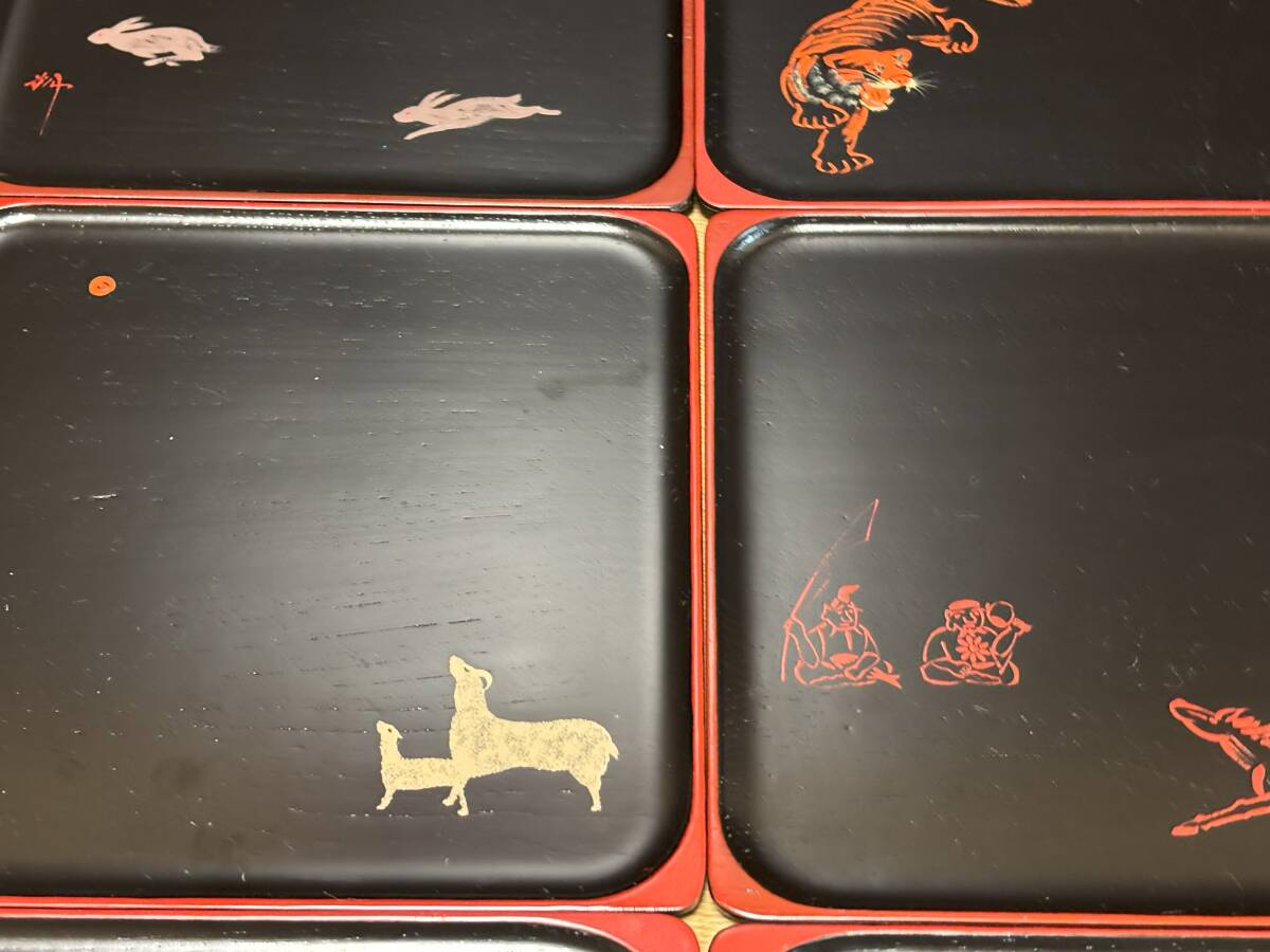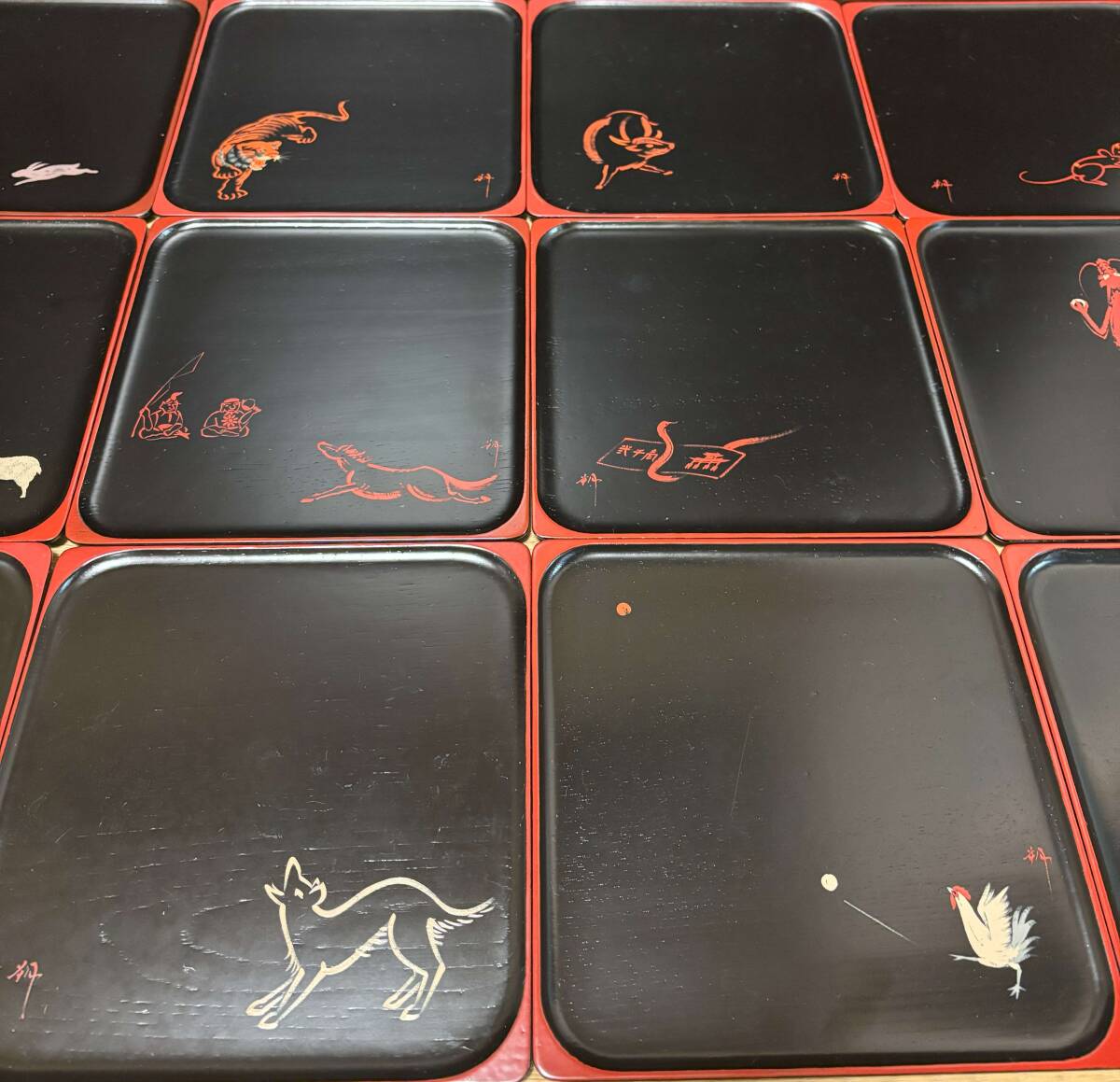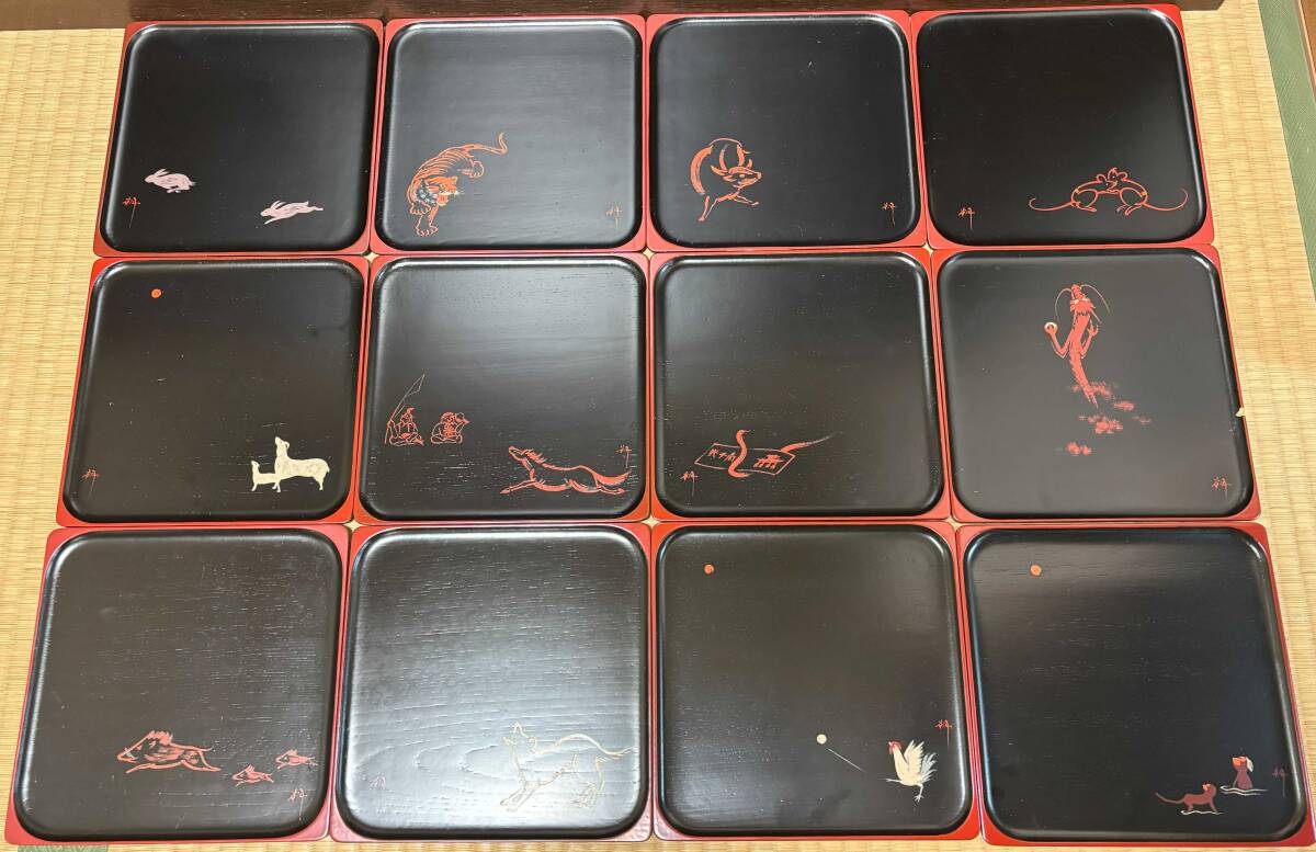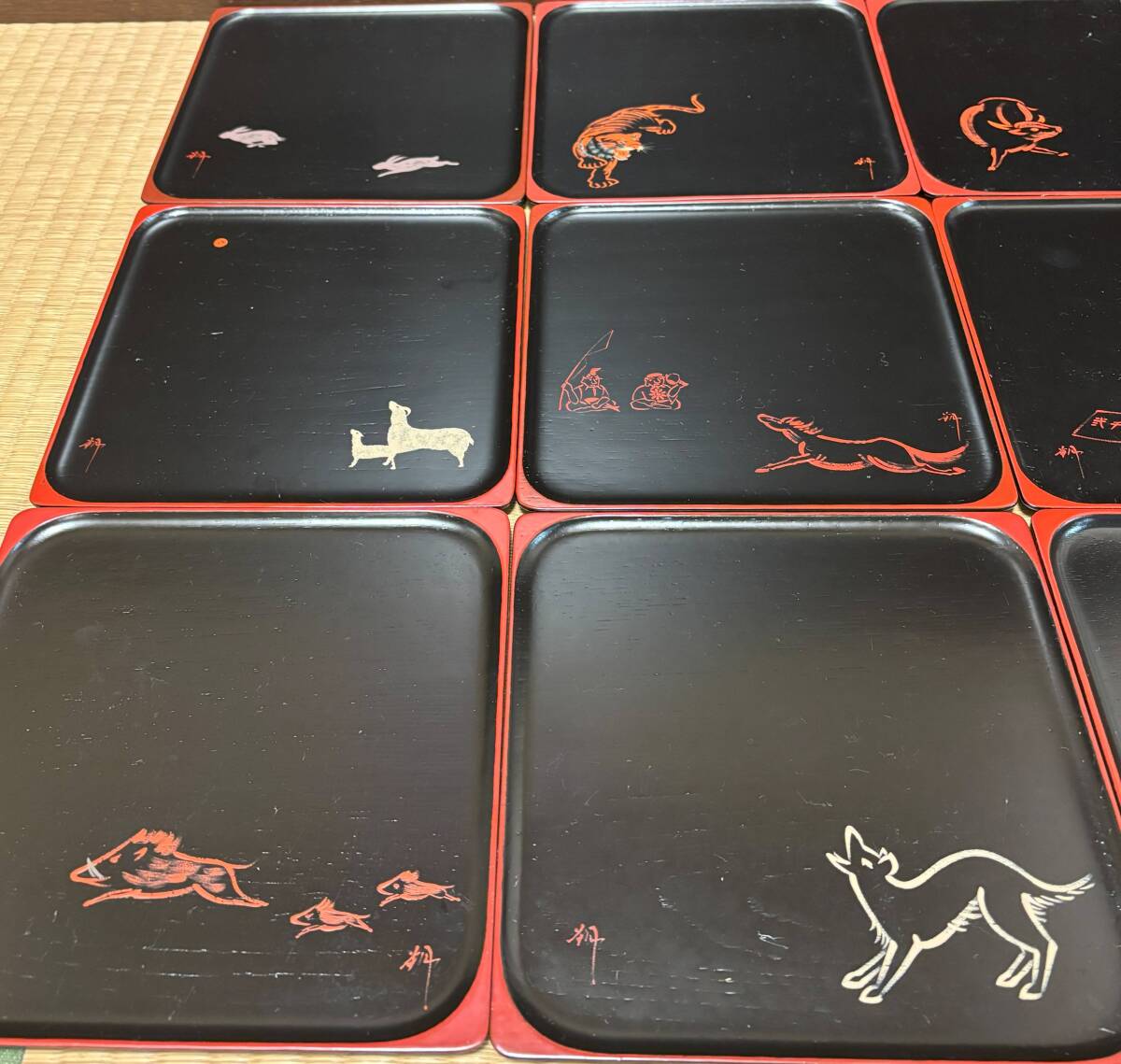 三代 表朔/鈴木雅也 干支絵 12枚 干菓子盆 茶道具 漆器 菓子盆 お盆