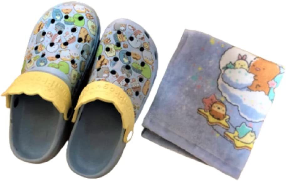 新品タグ付き すみっコぐらし EVAサンダル バックストラップ 総柄 レディース  L 24~26 ブルー&お任せミニタオル1枚