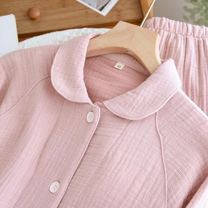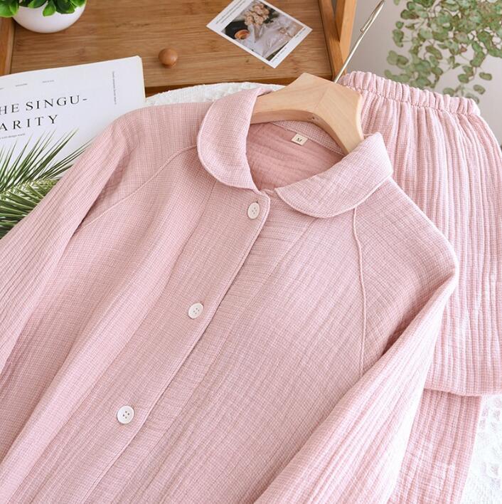 新作 上質ガーゼパジャマ ルームウェア L 4重ガーゼ綿長袖前開きコットン入院上下セット オールシーズン快適柔らかい ピンク