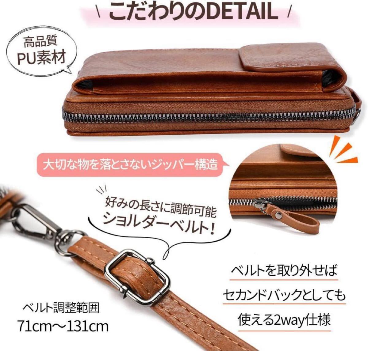 【細部のこだわり】 軽量、縦型、高品質のPU素材を使用しているので、丈夫で長持ち!ボタン式スマホ収納だから大事なスマホを落とさない!ショルダーベルトは71cm~131cmの範囲で調整可能!体に合わせて長さを調節できます。