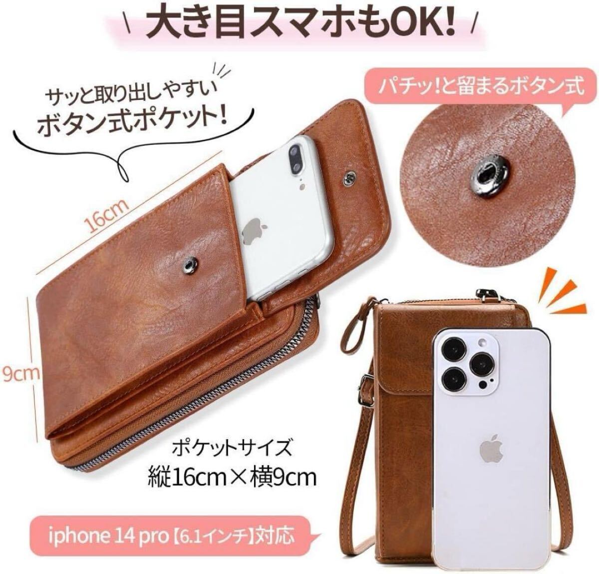 ・スマホポケットサイズ:縦16cm×横9cmショルダー:71cm~131cm。