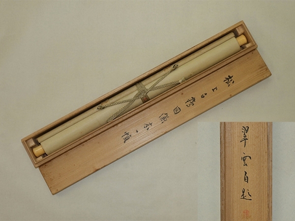 小室翠雲 こむろ-すいうん(1874-1945) 明治-昭和時代前期の日本画家。 明治7年8月31日生まれ。田崎草雲に学ぶ。 明治40年文展開設に際し、正派同志会を結成し文展新派に対抗。のち文展審査員。 大正10年矢野橋村らと日本南画院を設立。13年帝国美術院会員。昭和19年帝室技芸員。 昭和20年3月30日死去。72歳。群馬県出身。本名は貞次郎。 本紙は、染み、汚れ、折れ、皺、浮きがあります。 表装は、染み、汚れ、折れ、皺があります。 【サイズ】 作品 横約41.5cm×縦約128cm 表装 横約56cm×縦約211cm |