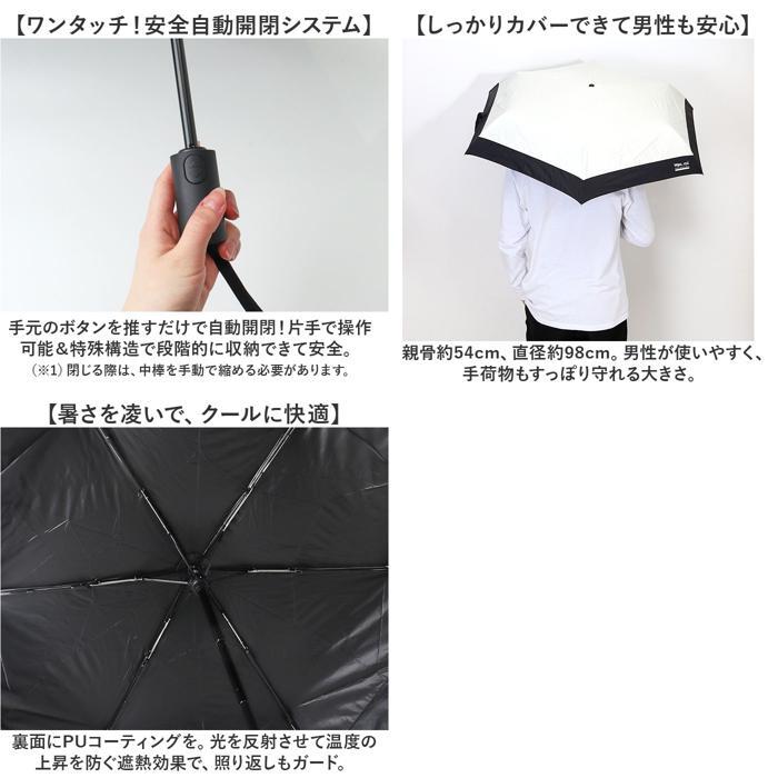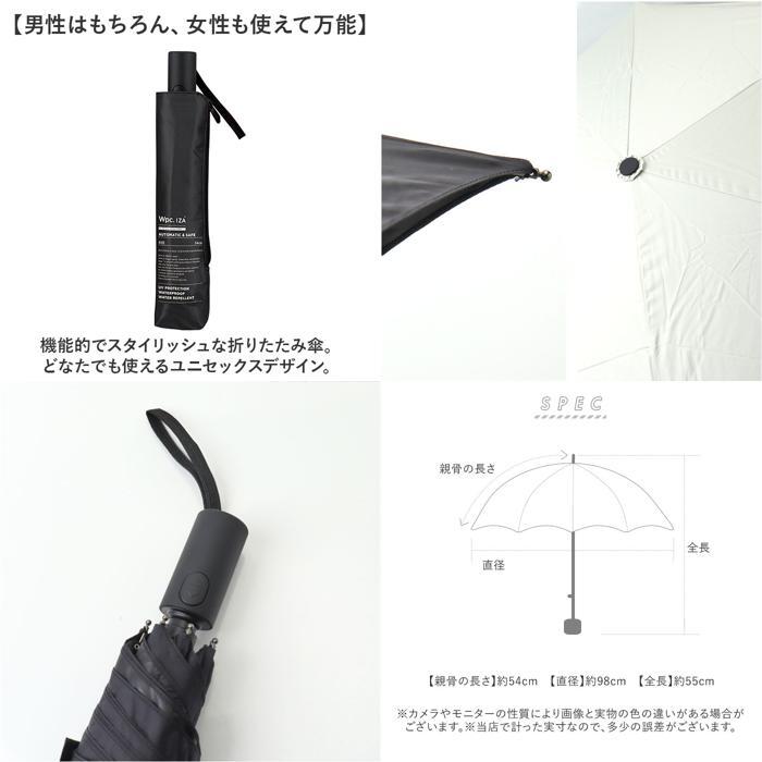 商品説明 | ・・【晴れの日も雨の日もこれ1本で完結】 ・天候問わずいつでも頼れる相棒☆「WPC.IZA 自動開閉晴雨兼用折りたたみ傘」。 ・【ワンタッチ!安全自動開閉システム】 ・手元のボタンを推すだけで自動開閉!片手で操作可能&特殊構造で段階的に収納できて安全。 ・(※1)閉じる際は、中棒を手動で縮める必要があります。 ・【しっかりカバーできて男性も安心】 ・親骨約54cm、直径約98cm。男性が使いやすく、手荷物もすっぽり守れる大きさ。 ・【遮光&UVカットで紫外線から守る】 ・遮光率、UVカット率100%、UPF50+!光を通しにくく、気になる紫外線をカット。 ・(※2)ブルーライトカット効果もあります。 ・【暑さを凌いで、クールに快適】 ・裏面にPUコーティングを。光を反射させて温度の上昇を防ぐ遮熱効果で、照り返しもガード。 ・【暑い季節の大敵、汗を抑える効果も】 ・体感温度が下がり、汗の量も低減。イヤ~な汗ジミなどを抑えてくれる◎ ・【優れた撥水力で雨の日も安心】 ・撥水最高等級5級の傘生地。雨粒もサッと弾いて、お天気の急変にも対応。 ・(※3)UVカット・遮光率・UPF値・撥水等級は、生地の状態での測定値です。 ・【大雨にも負けない耐水性を装備】 ・大雨の際も水の侵入を防ぐ、耐水圧10,000mmH2O以上を実現。 ・【サッとまとまる面ファスナーバンド】 ・傘生地をまとめるバンドは、面ファスナー式。たたむ時も手間取らず、ひとまとめ。 ・【持ち歩きやすい収納袋付き】 ・ファスナー式の収納袋が付属。カバンに忍ばせて、スマートに持ち運べるのが嬉しい! ・【男性はもちろん、女性も使えて万能】 ・機能的でスタイリッシュな折りたたみ傘。どなたでも使えるユニセックスデザイン。 |
