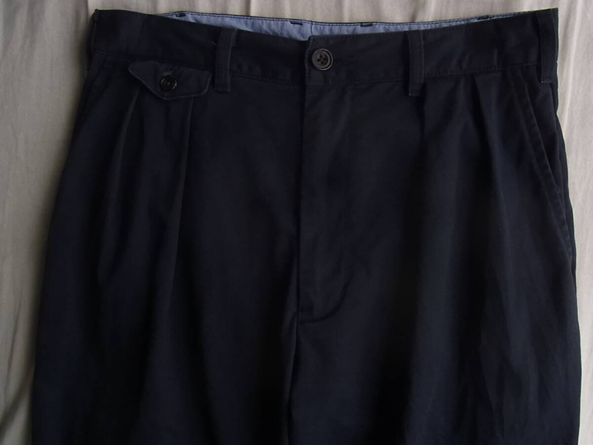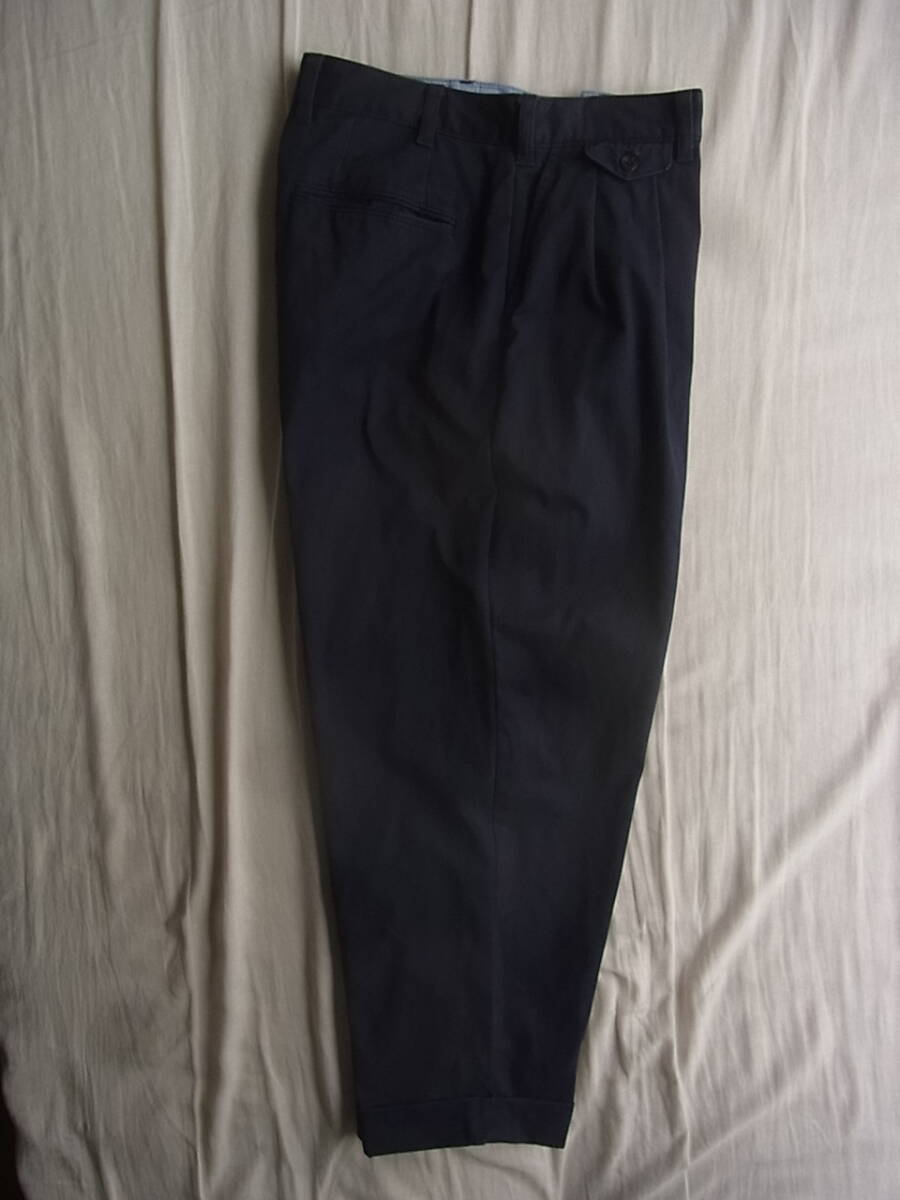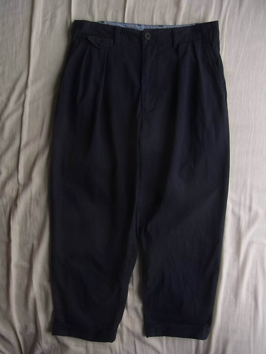 ビームス プラスのストレッチチノ素材で2プリーツのワイドテーパードシルエットパンツになります。USEDで着用感と濃色の為多少の色褪せは御座いますが、それ以外には特に目立ったダメージ等は御座いません。