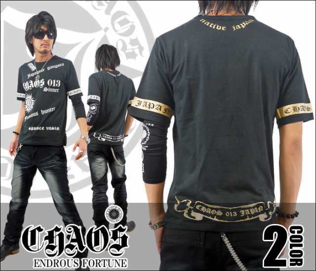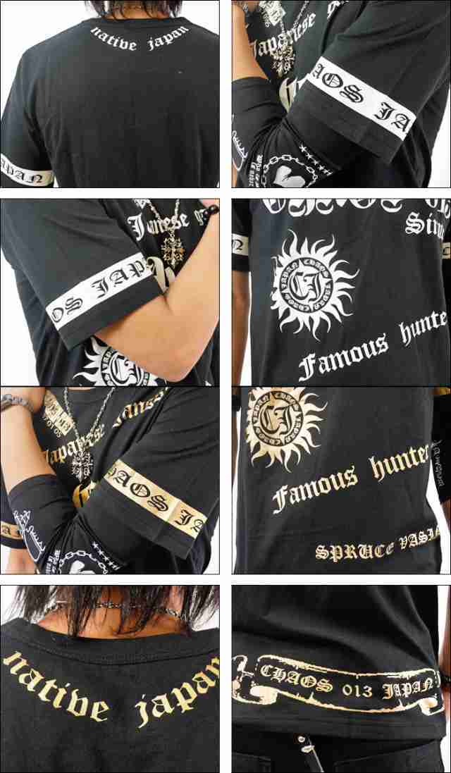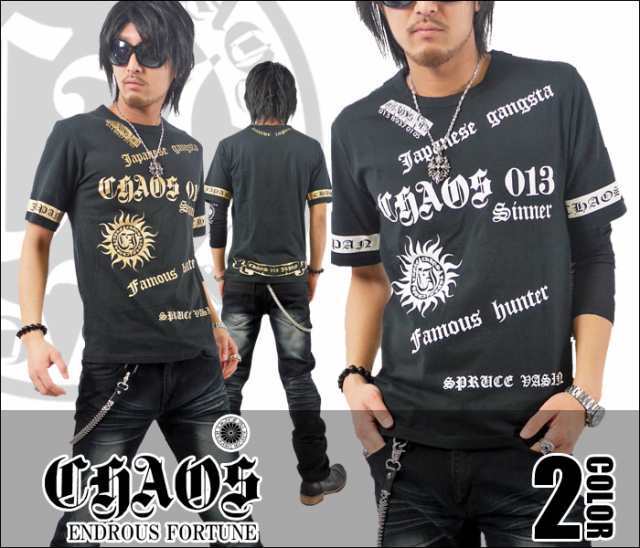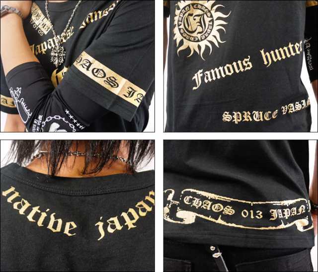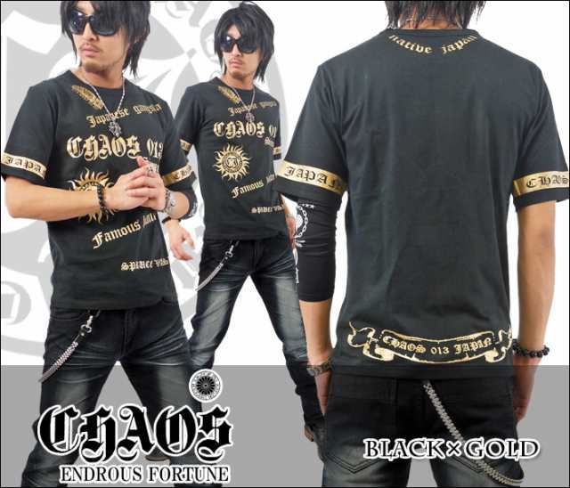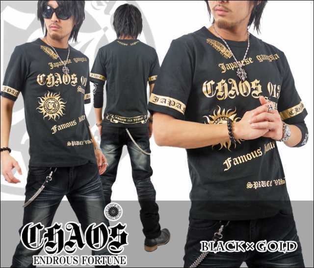 CHAOS JAPAN トライバルSUNプリント 腕 サイド バック 英字プリント 半袖Tシャツ ch-ry-2011新品ブラック×ゴールド XL