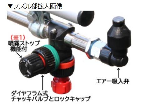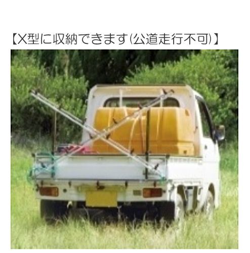 | ・軽貨物自動車等にセットできる簡易なブーム噴口で、X 字形に三つ折り可能なため、圃場(田畑等) での移動の際にはコンパクトに収納できます。 (本商品を装着したままの状態では、X 字形に収納しても車幅より広くなるため、公道を走行することは 法令等により禁じられています。) ・付属のブーム取付金具セットにより、軽貨物自動車等への着脱が簡単で、用途に応じて散布するノズルの 高さを調整できます。 ・ダイヤフラム式チャッキバルブとロックキャップ(緩み止めキャップ)により、ノズルからのボタ落ちと キャップの緩みを防止します。 ・キャップを閉めると噴霧ストップができる噴霧ストップ機能付。噴霧時はキャップを緩めます。 ・凍結防止のため、ノンフリーズ弁とエアー吸入弁を採用。 管内の残液をワンレバーで抜くことができます。 ・一度に広範囲の散布が可能で、労力の軽減と時間の短縮が可能です。 ・噴管には、腐食に強いステンレスを採用しています。 ・ノズルを交換することにより様々な作物・用途に応じた使用が可能です。 | |