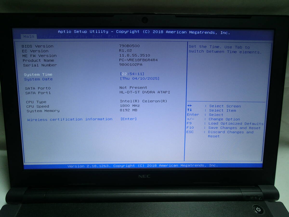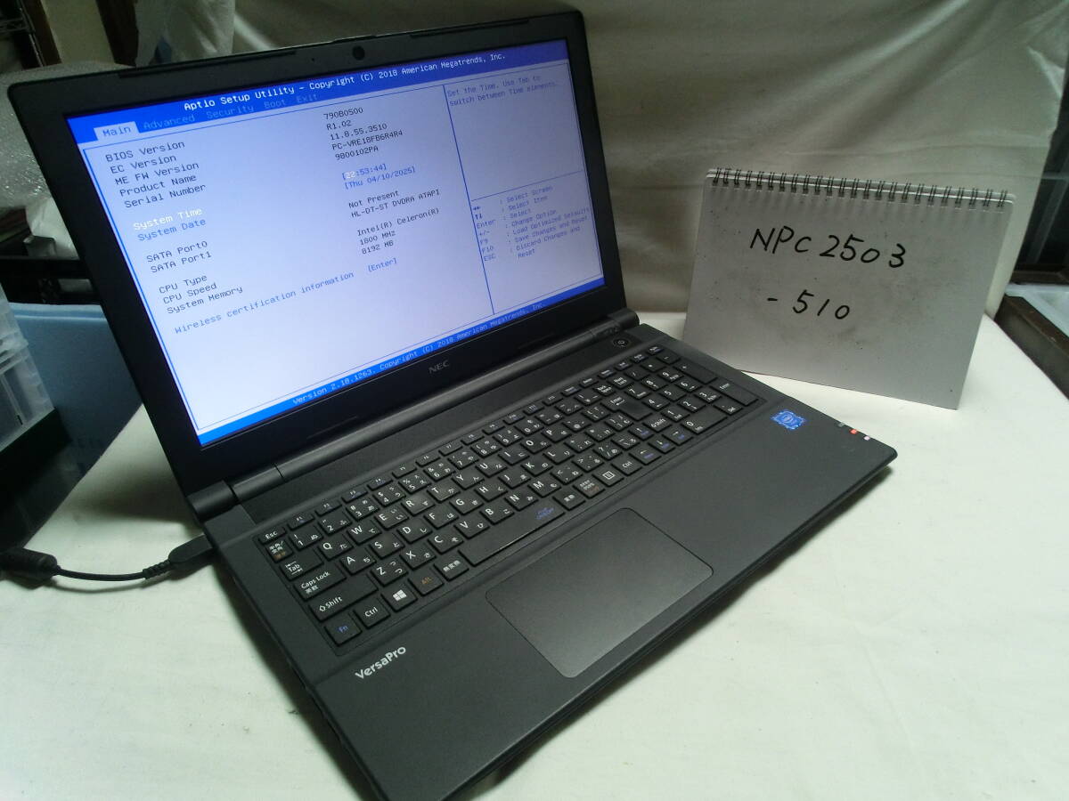 【ジャンク】動作確認済 NEC VersaPro PC-VRE18FB6R4R4/Intel Celeron 3865U/メモリ8GB/15.6型 WXGA(1366×768)/管理番号:NPC2503-510