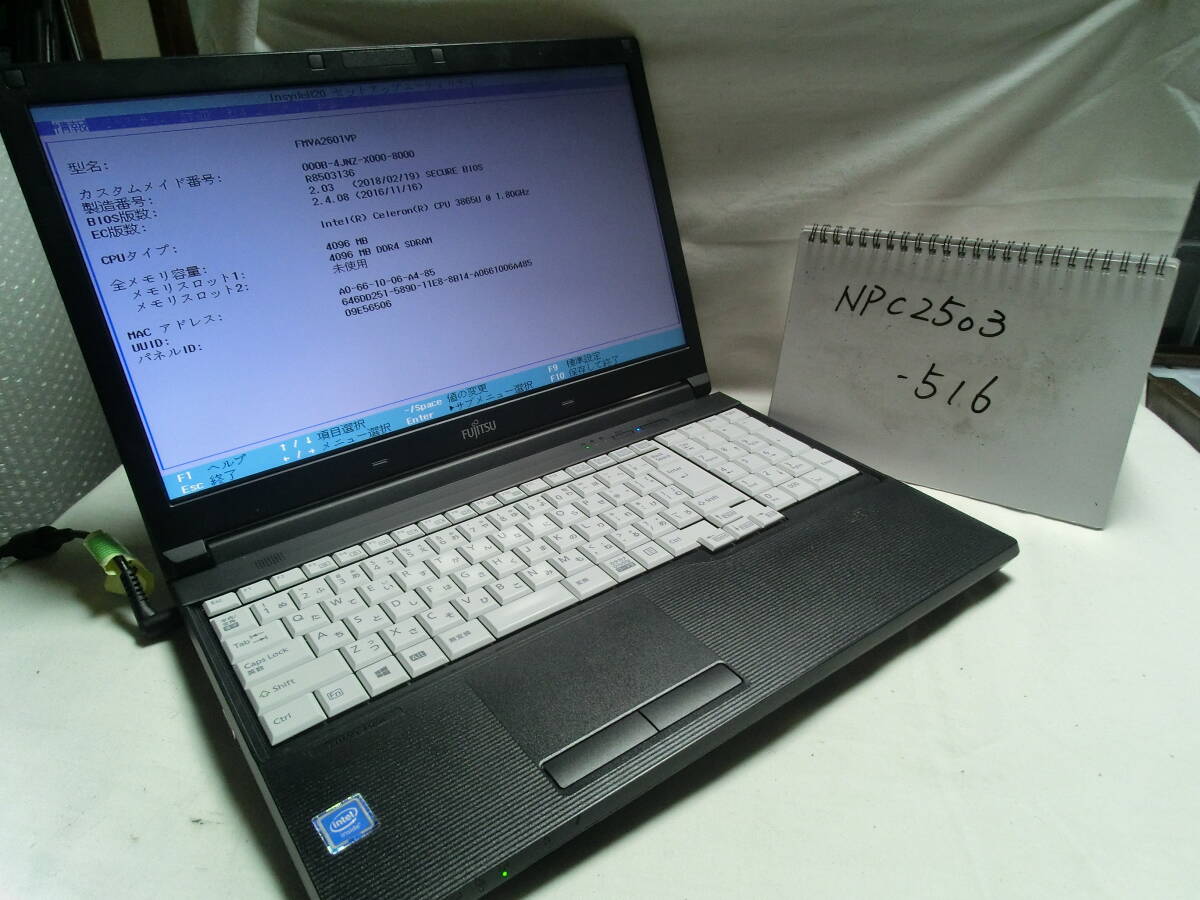 【ジャンク】動作確認済 FUJITSU LIFEBOOK A577/SX FMVA2601VP/Intel Celeron 3865U/メモリ4GB/15.6型 WXGA(1366×768)/管理番号:NPC2503-516