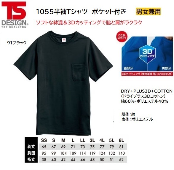 [ネコポス発送/1枚]★TSDESIGN 1055半袖Tシャツ ポケット付き【91ブラック・SSサイズ】定価3000程度の品、即決880円!!