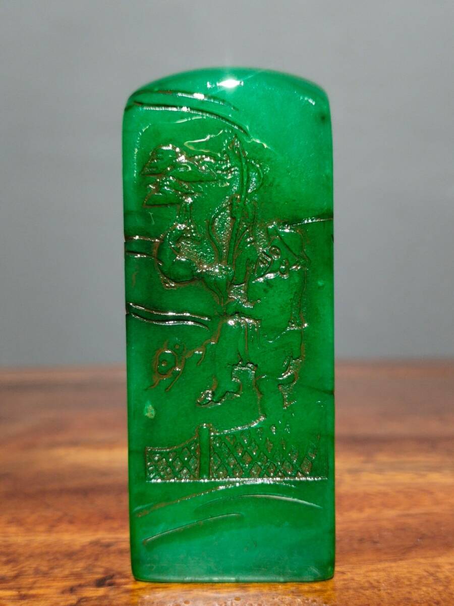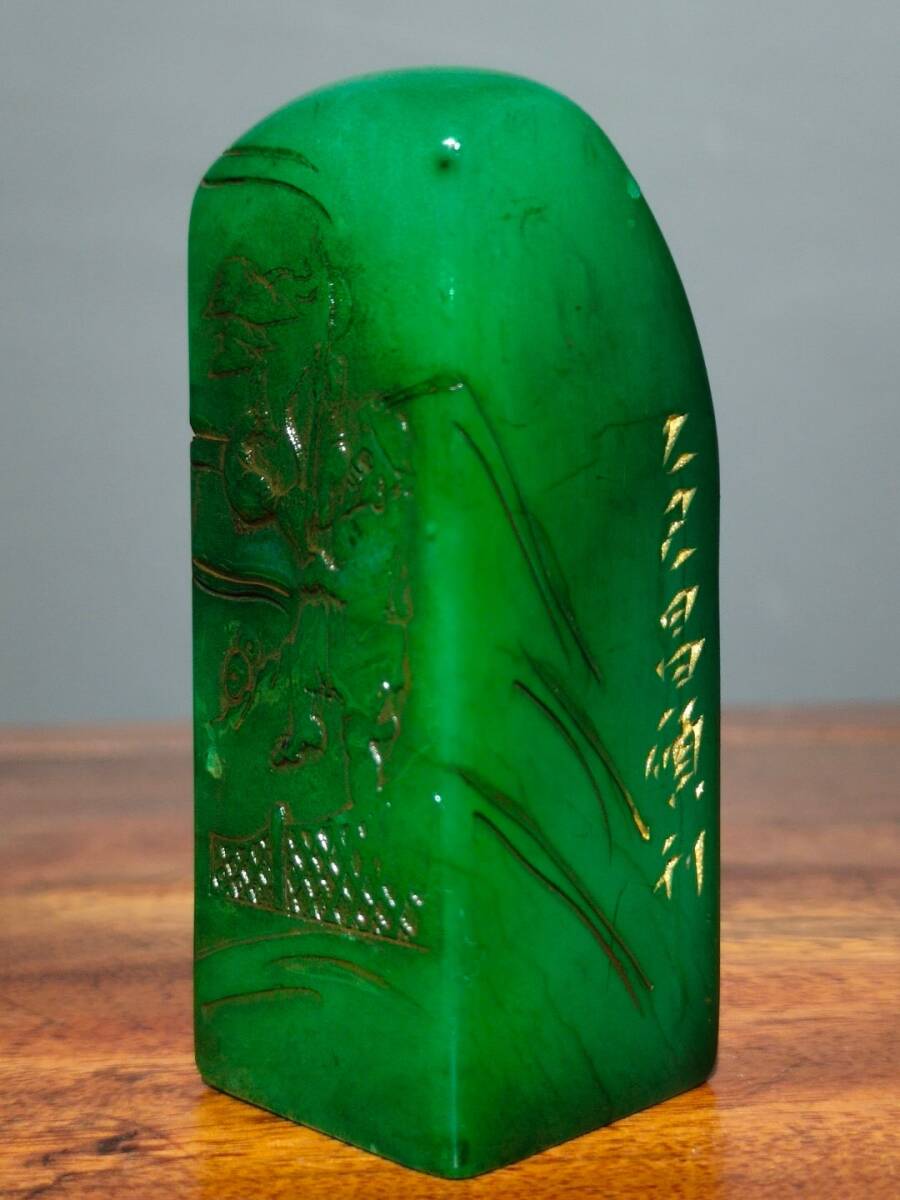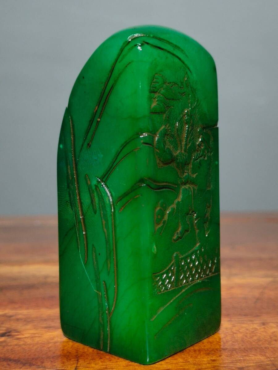 【超珍館蔵】寿山石 綠田黄石 細密彫 松溪垂釣紋印章 文房具 書道品 古賞物 古美術品 稀少珍蔵品