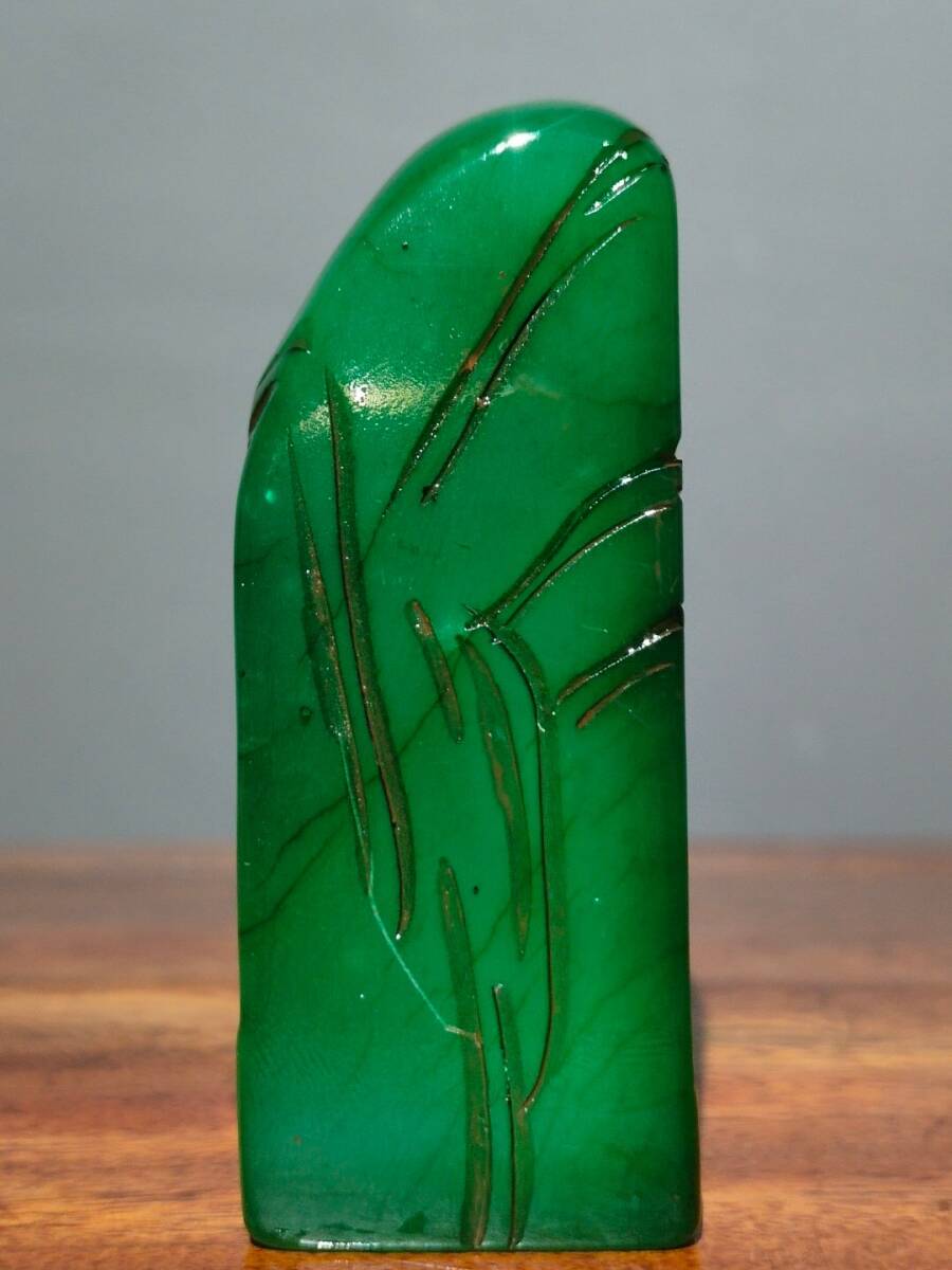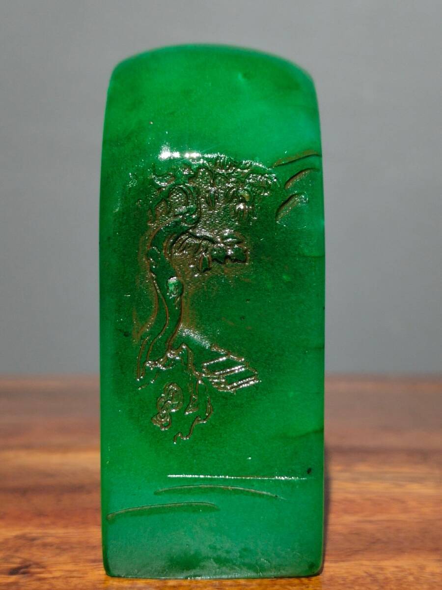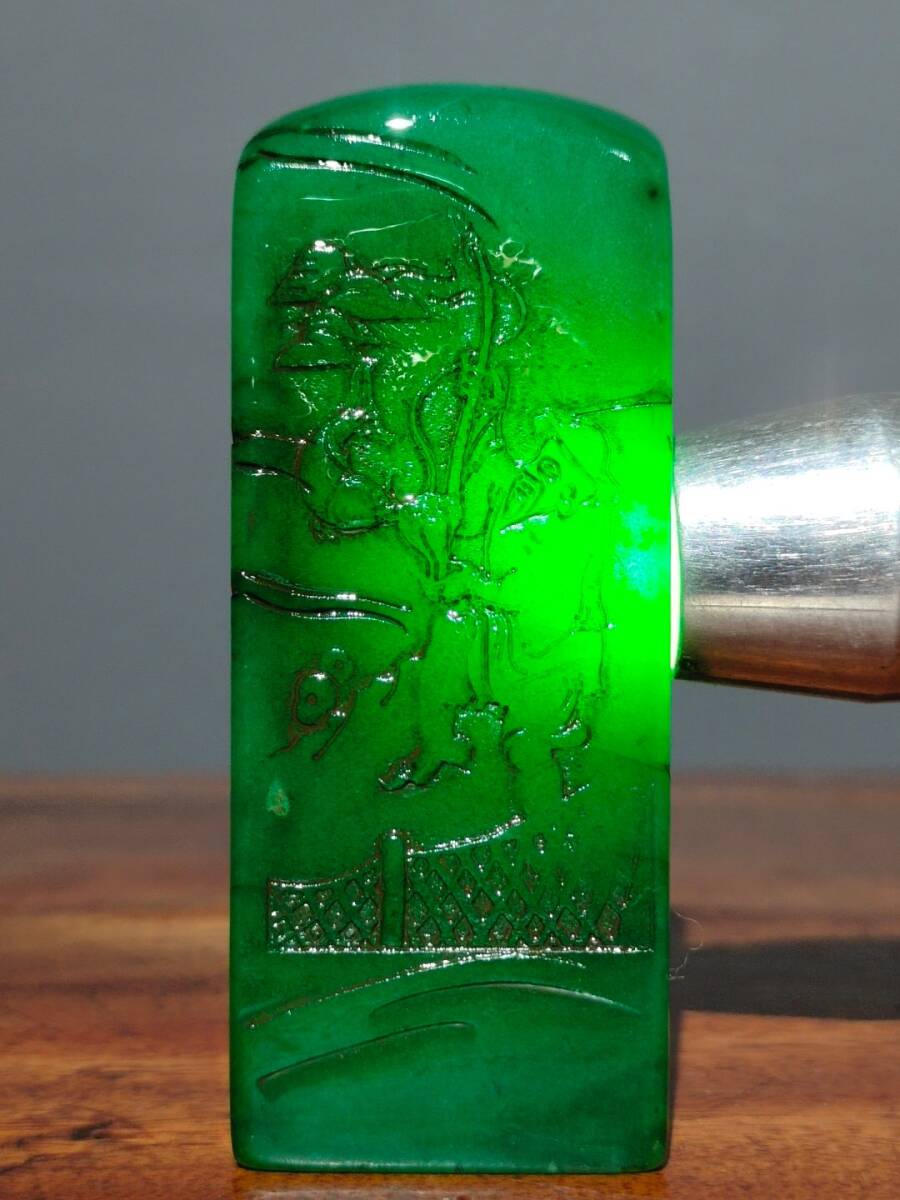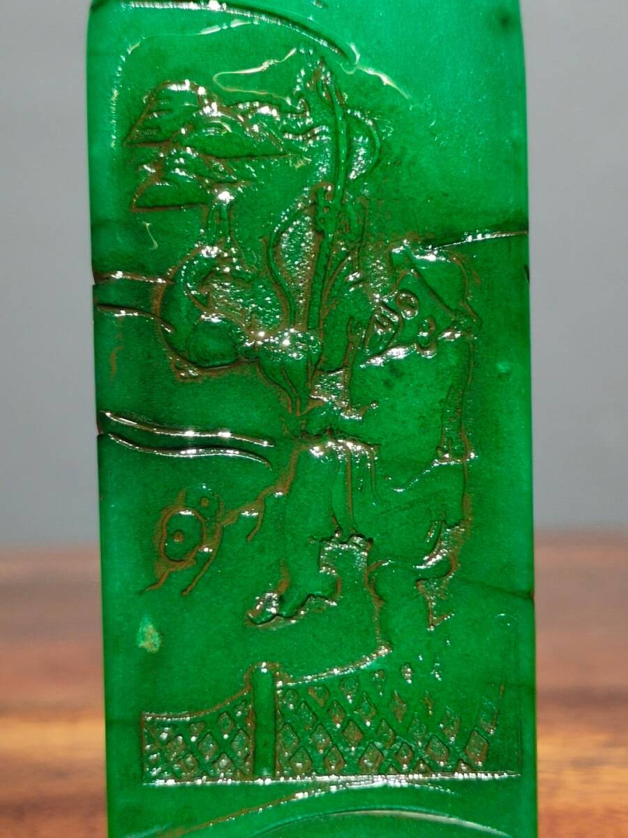 【超珍館蔵】寿山石 綠田黄石 細密彫 松溪垂釣紋印章 文房具 書道品 古賞物 古美術品 稀少珍蔵品