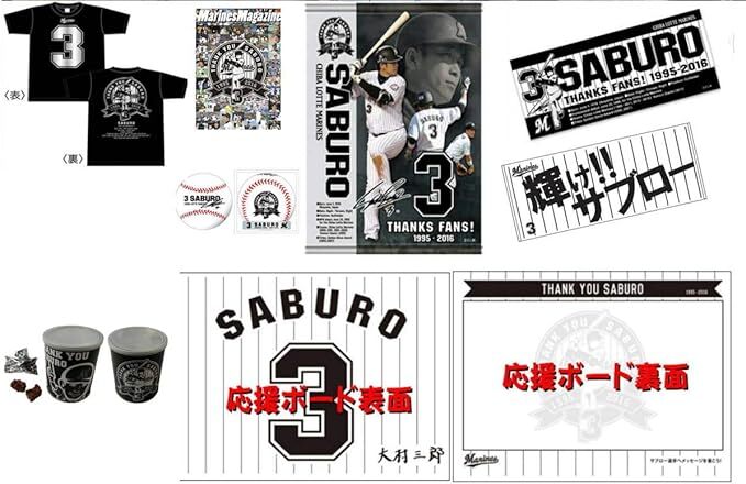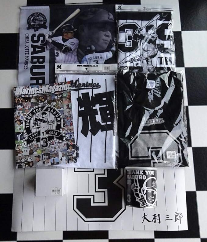 ①【千葉ロッテ】サブロー選手引退記念 Tシャツ(Lサイズ) ②【千葉ロッテ】サブロー選手引退記念 フェイスタオル ③【千葉ロッテ】サブロー選手引退記念 サインボール ④【千葉ロッテ】サブロー選手引退記念 タペストリー ⑤【千葉ロッテ】MarinesMagazine特別号(サブロー選手特集)来場者配布品 ⑥【千葉ロッテ】サブロー選手引退記念 応援ボード(来場者配布品) ⑦【千葉ロッテ】サブロー選手引退記念 チョコクランチ(賞味期限切れ) ※梱包缶をお楽しみください ⑧【千葉ロッテ】サブロー選手 応援歌タオル ※上記①~⑧の合計8点セット 商品状態:新品・未使用品 ※新品未使用品ですが出品写真撮影の為、開封済みです ※個人保管の為、現地からの持帰り時や保管時のしわ・汚れ・経年劣化等ある場合があります。 (気になる個所は添付写真をUPいたします) ※現物の写真を掲載してありますので状態判断してください ※ 細部までのチェック不足により上記に該当する場合もありますので予めご了承お願いいたします。 サイズは添付写真にて判断してください。 ※添付写真背景の黒(又は白)正方形は約15㎝×15㎝です | ||||