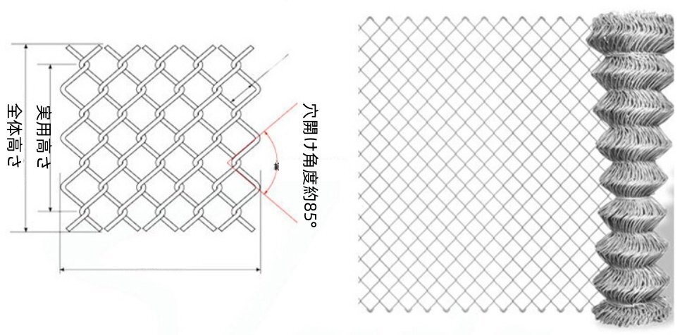 「縦支柱厚み、縦支柱直径、横支柱厚み、横支柱直径、穴サイズ、表面処理後のワイヤー太さ、一巻きの高さ*長さ、支柱の取り付け方式(埋め込み式固定/ベース式固定)」