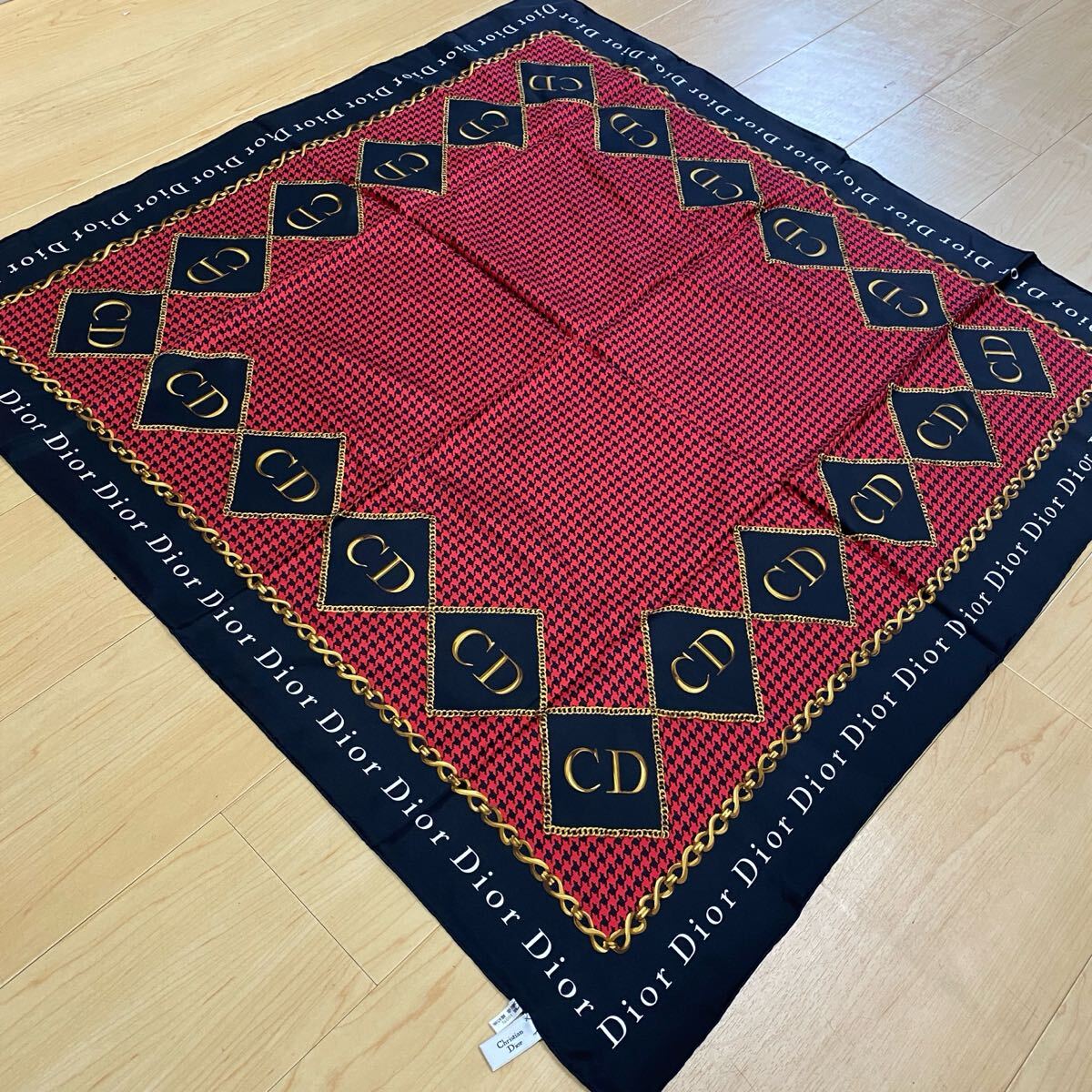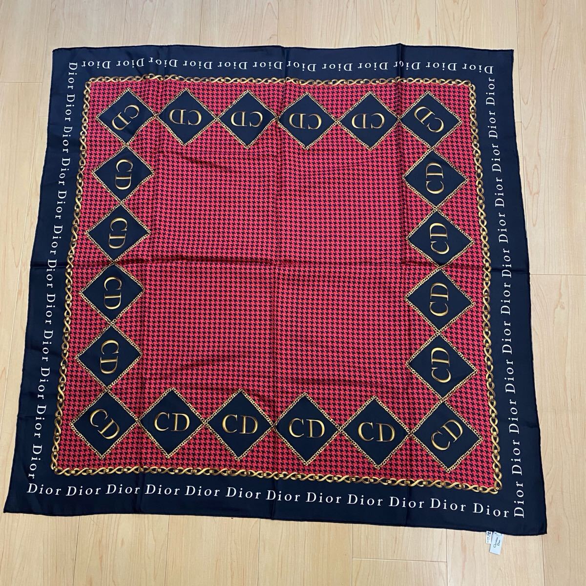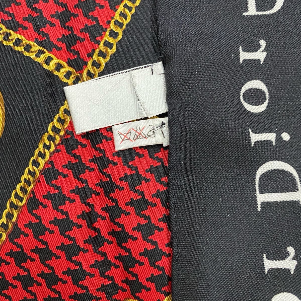 Christian Dior クリスチャンディオール スカーフ レッド ブラック 千鳥格子 ふちロゴ・ブラック  no.41