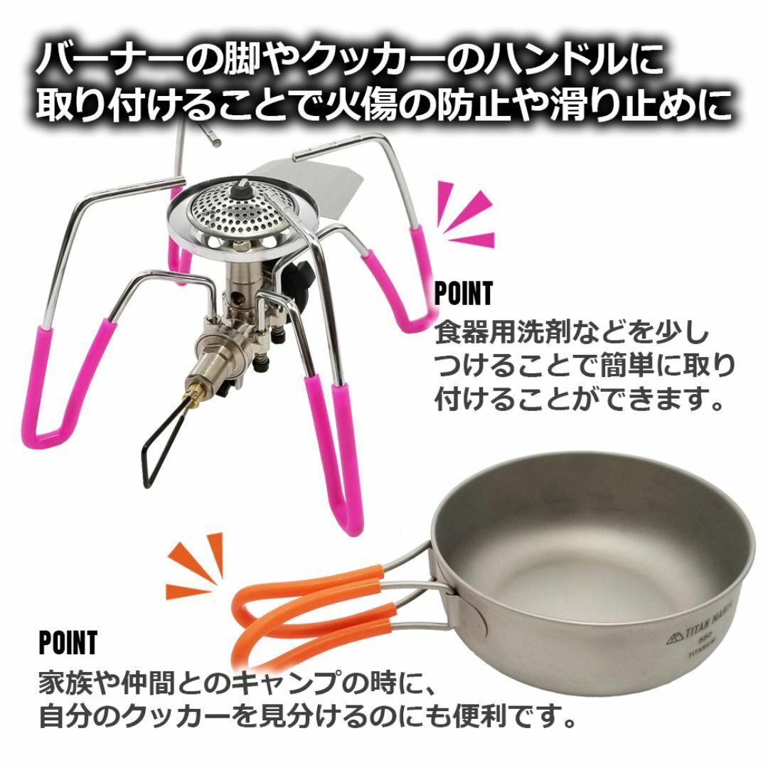シリコンは耐熱・耐圧・耐震・耐久性に優れています。クッカーのハンドルに取り付けることで、持ち手が熱で持てなくなることを防ぎ、バーナーの脚などに取り付けることで滑り止めになります。