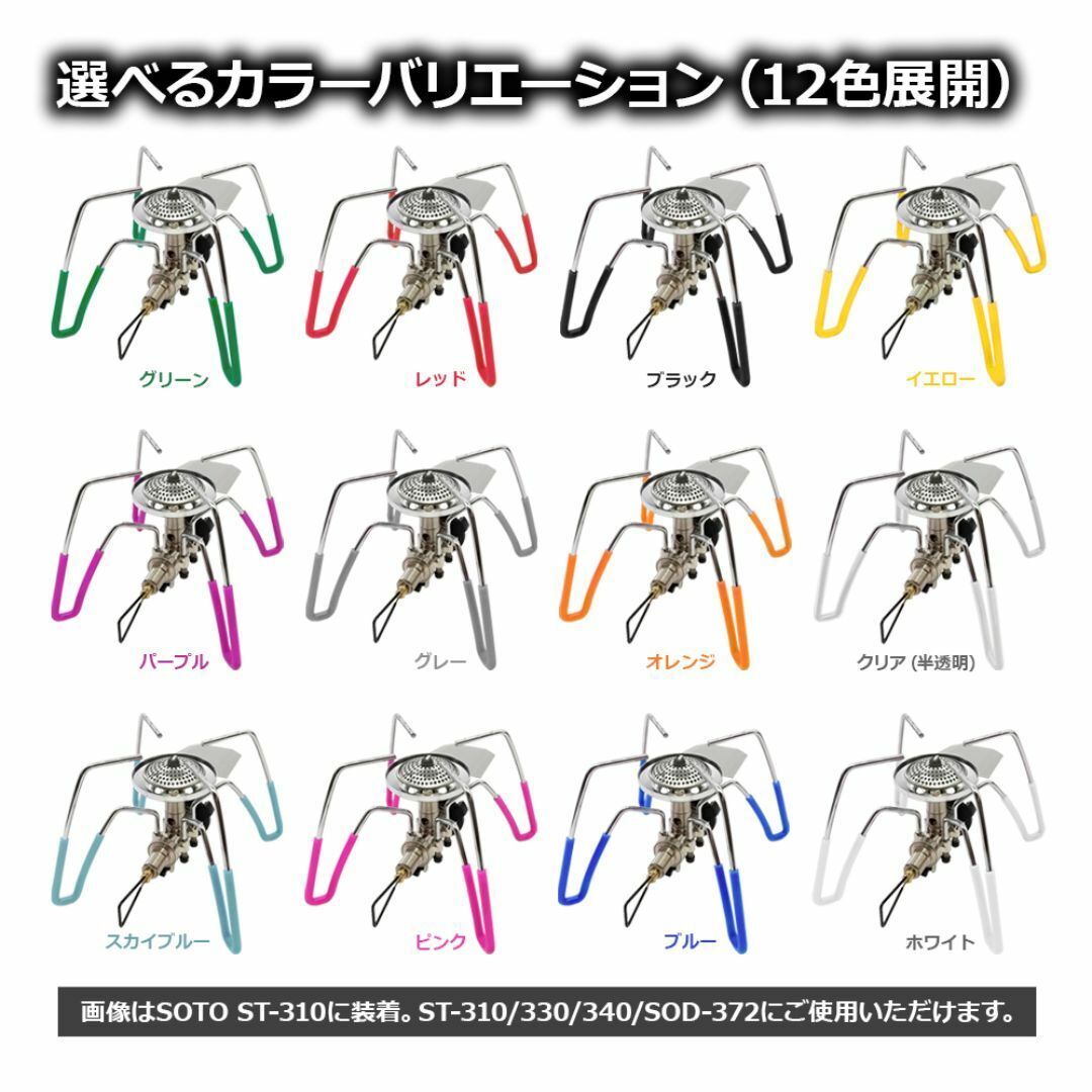 SOTO製のST-330、ST-340、ST-310のアシストグリップの代用としてお使いいただけます。シングルバーナー、レギュレーターストーブのドレスアップ、ゴトクのスベリ止めと五徳が熱くなったときの伝導熱をカバーします。