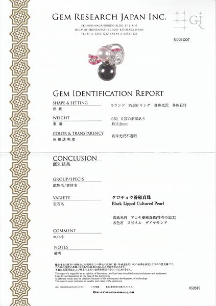 ☆じゅえりぃばんく☆ ミキモト MIKIMOTO ハイクラス ! PT 黒蝶真珠 あこや真珠 スピネル ダイヤモンド リング【鑑別書付】