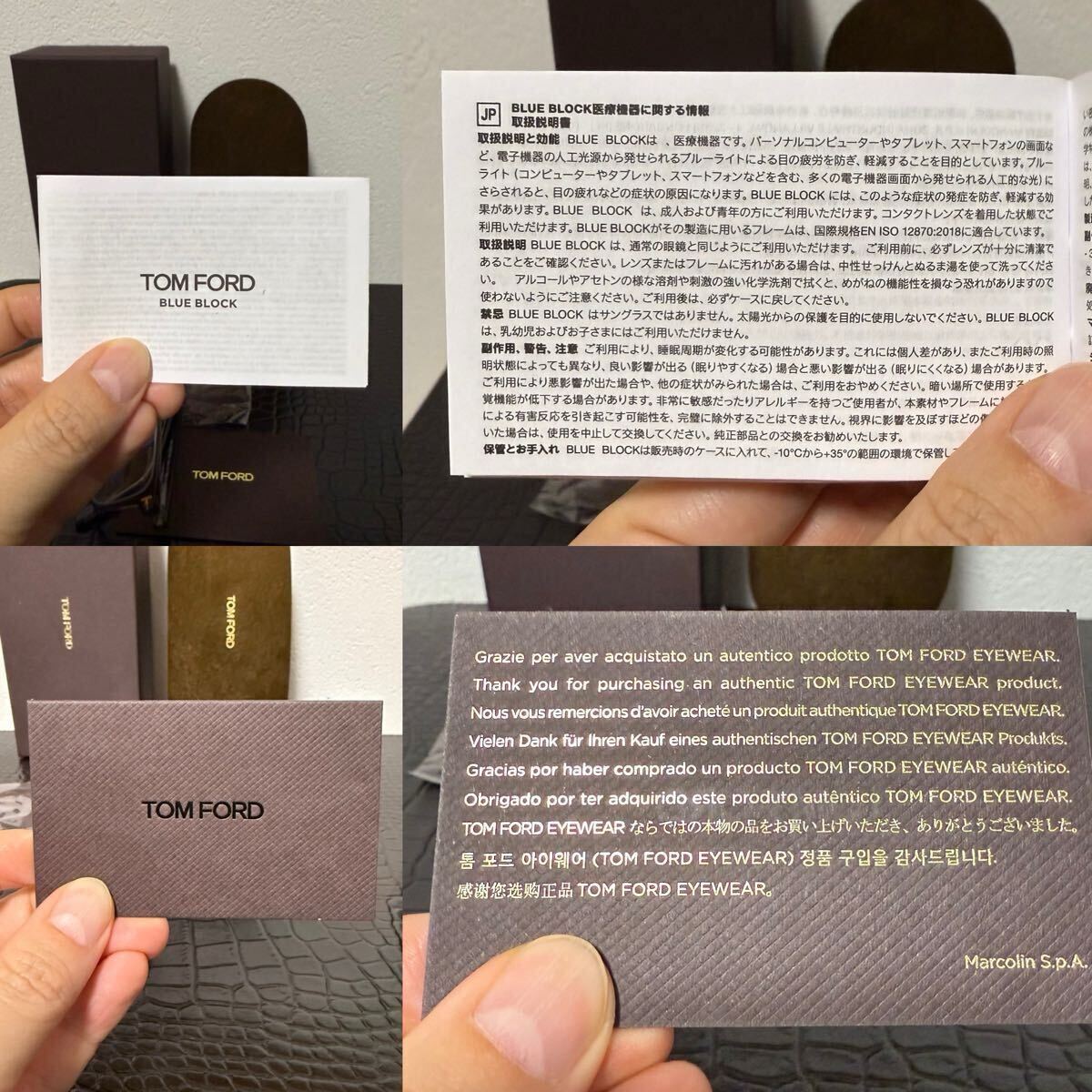 写真5枚目の外箱、ケース、メガネ拭き、証明カード、ブルーライトブロック説明書が付属します。