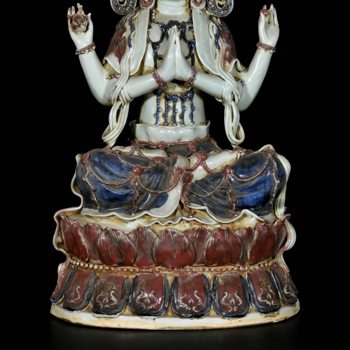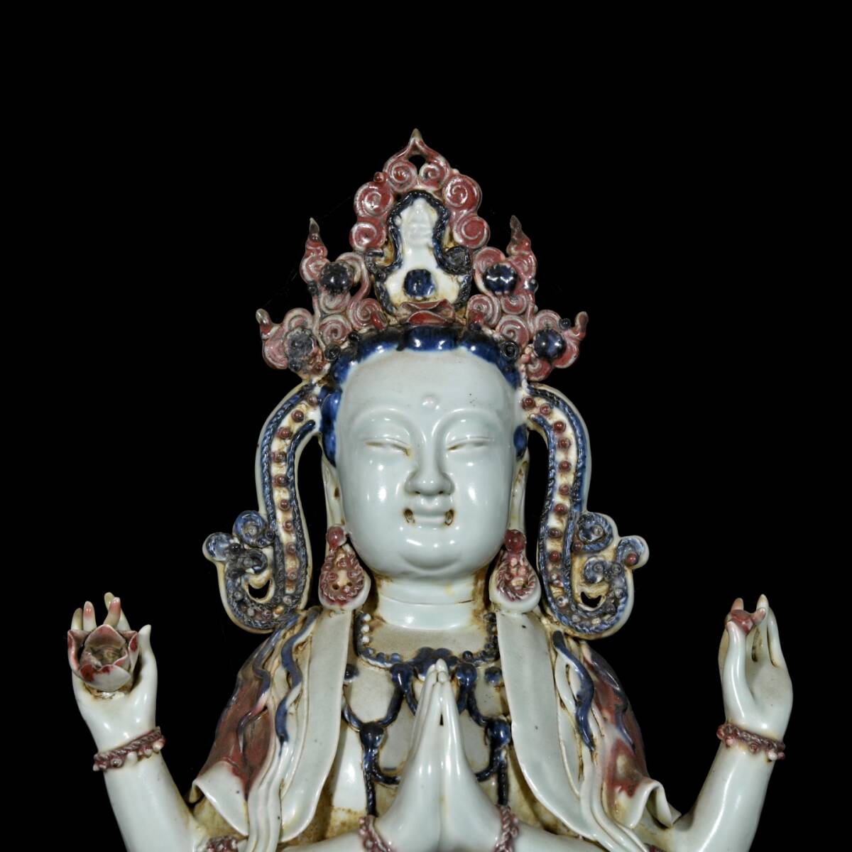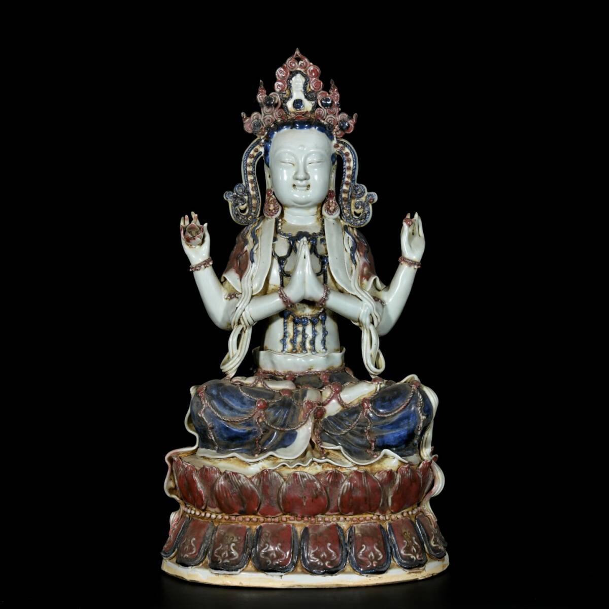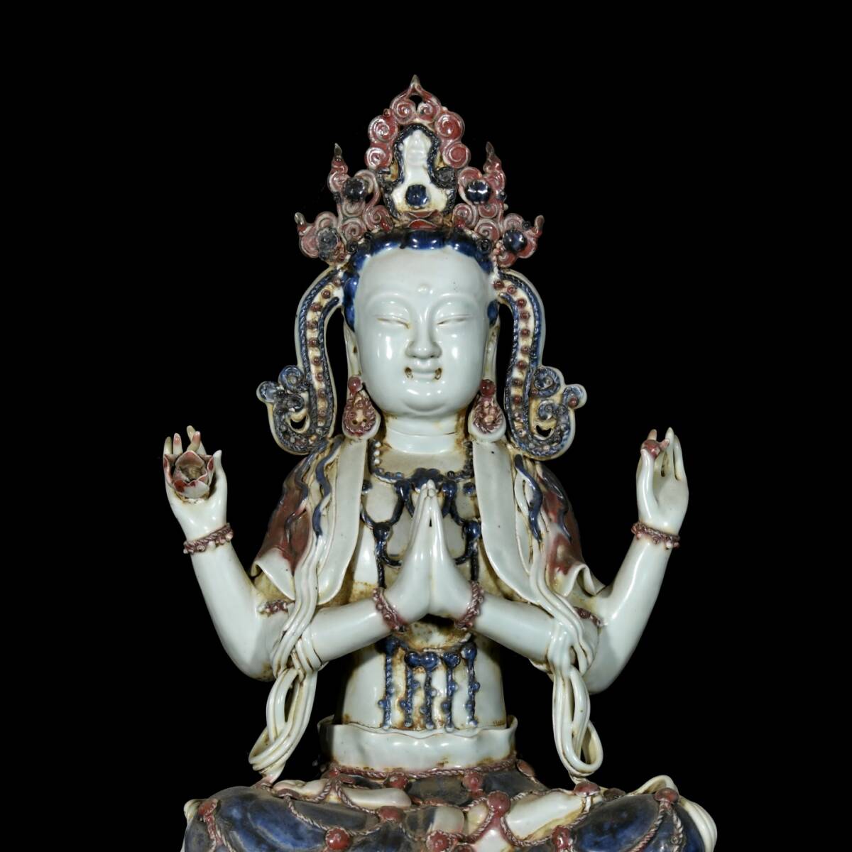 *珍品旧蔵* 元 青花 釉裡紅 坐蓮四臂觀音 仏像 陶磁器 極細工 唐物 中国磁器 中国古玩 陶芸 H44
