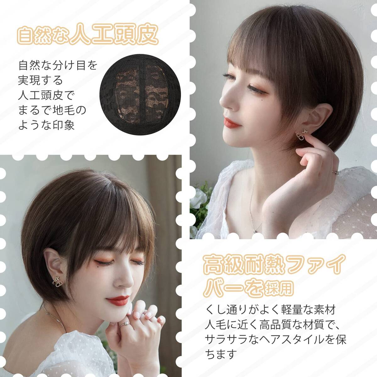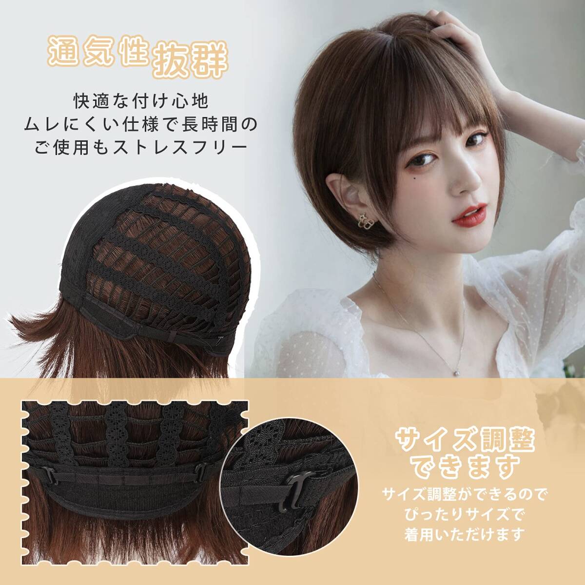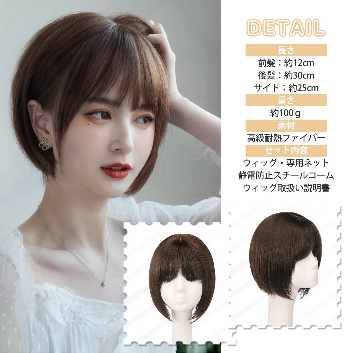 商品説明 | ?【素材】耐熱性高品質ファイバーを使用しているショートボブウィッグ!ライヤー/コテ使用OK。 人毛に似た素材で地毛とも良く馴染みます!絡みにくくウィッグ用ブラシで簡単に解けるので手入れも簡単!素材自体を軽くすることで着用時の重量感も最小化! ?【長さ】前髪:約12cm、 後髪:約30cm、サイド:約25cm(ウイッグが自然状態での採寸、 つむじから)、 重さ:約100g。 ?【サイズ】フリーサイズ(サイズを多段階アジャスター付きので段階調節することができる。頭周り:約56~58? )。 ?【カラー】:全4色。 オイルブラウン、ライトブラウン、チョコレート、亜麻色。自分の好みによってカラーを選ぶことができるボブウィッグです!?モニターの環境により、実物と色が多少異なる場合が御座います。予めご了承下さい。 ?【スタイル】季節を問わずふんわりした、小顔効果抜群のかわいいショートボブ・ウィッグです!日常用はもちろんOK。パーティー、成人式、お花見などのイベントで、気分転換に挑戦してみませんか?