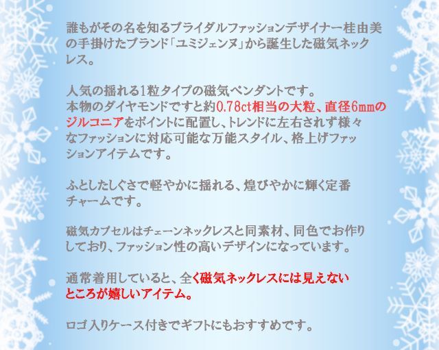誰もがその名を知るブライダルファッションデザイナー桂由美の手掛けたブランド「ユミジェヌ」から誕生した磁気ネックレス。